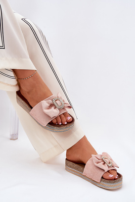 Dámské Pantofle Na Platformě S Mašlí A Ozdobnou Broží Růžové Lenela