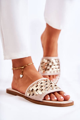 Módní pantofle s řetízkem na plochém podpatku zlatá Finess