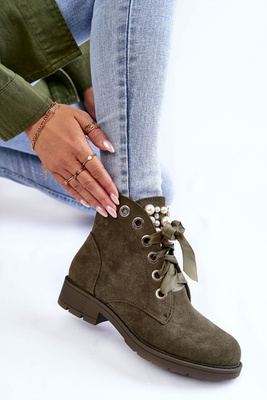 Semišove zateplené kozačky na zip s perličkami tmave béžové Raiso