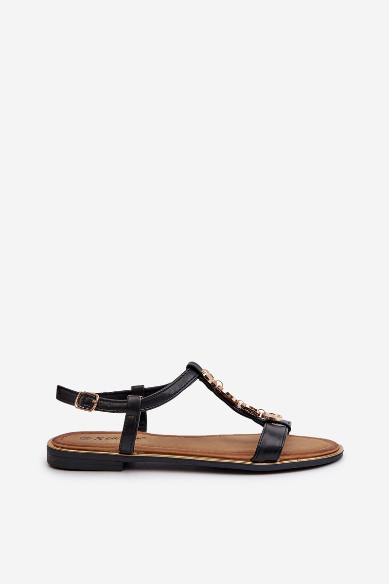Dámské sandály s decentními zlatými ozdobami. Vyrobené z ekologické kůže. Na plochém podpatku. Zapínají se na nastavitelný popruh s přezkou, jsou jak módní, tak pohodlné. Ideální pro každodenní outfit. Při výběru velikosti se řiďte tabulkou velikostí.