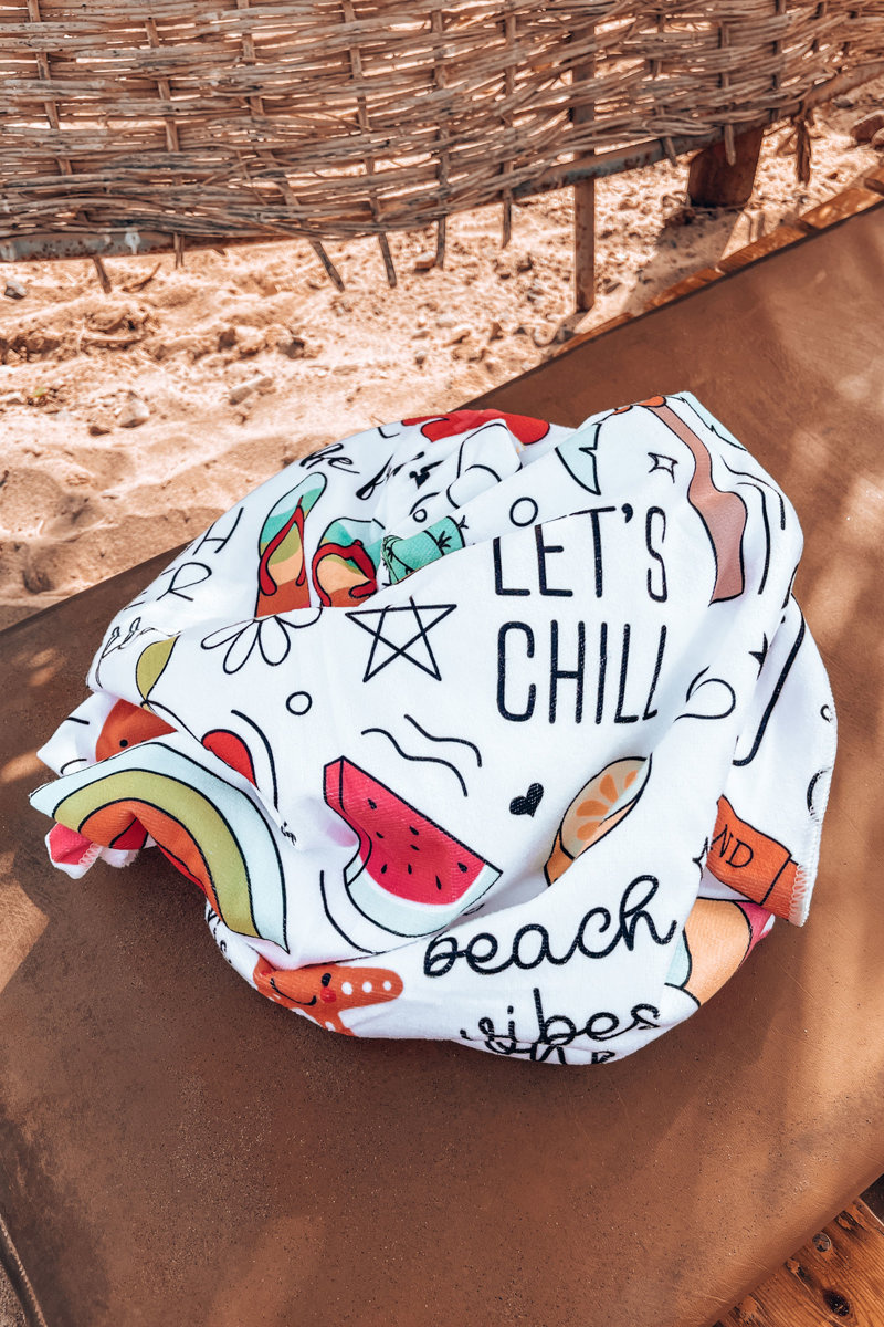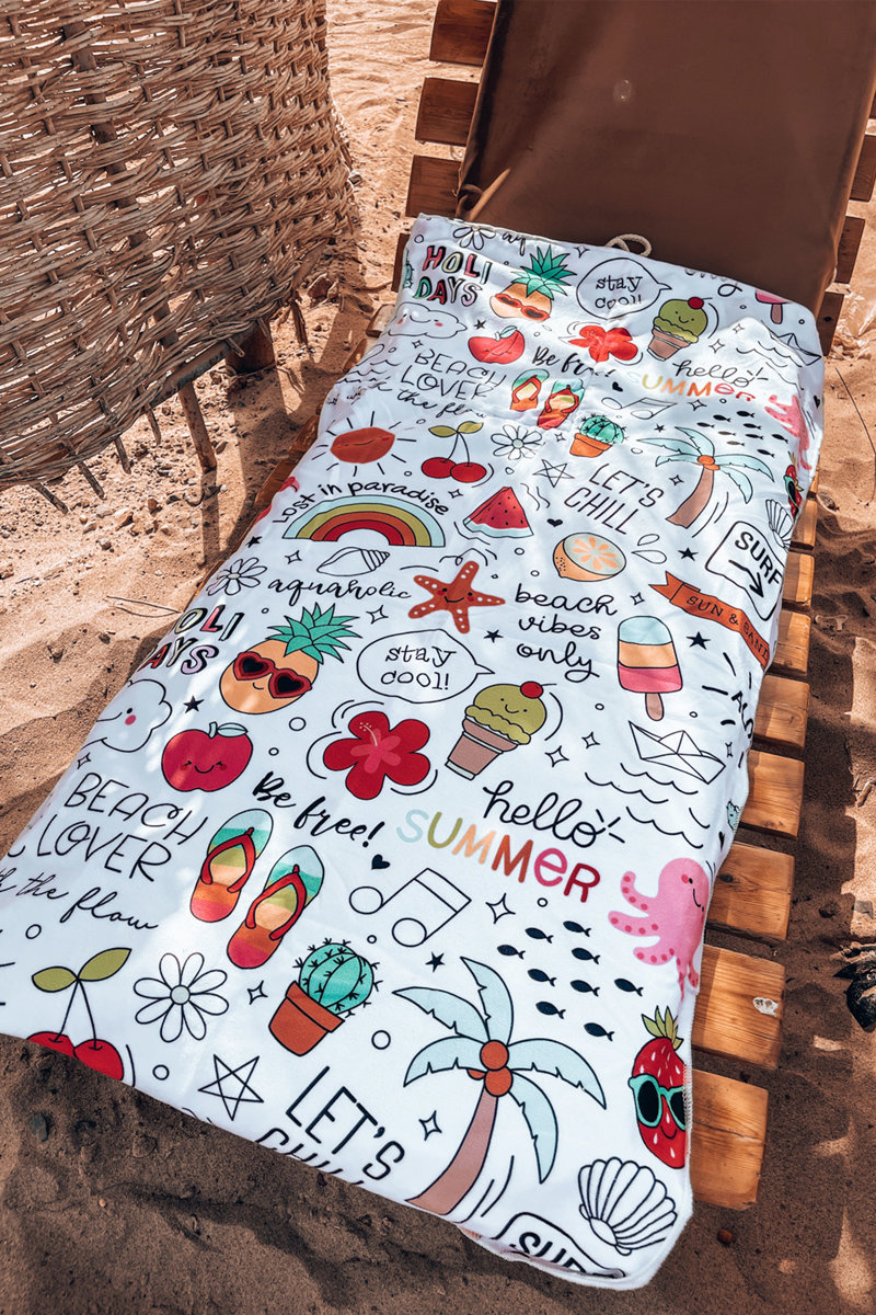 Plážový batoh 3v1. Výrobek je lehký a příjemný na dotek. Taška má dvojitá tkaná ucha a stahovací šňůrku v horní části. Batoh je vybaven přídavným ručníkem, který se skvěle hodí na dovolenou nebo dovolenou na písečné pláži. Velmi funkční a snadno sestavitelné. Složení: 65% polyester, 35% bavlna.