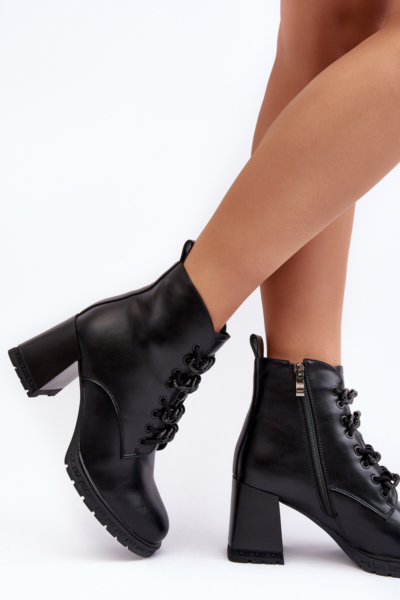 Dámské boty s kotníkovou krajkou. Šněrování a navíc na zip na straně. Umístěné na podpatku ve formě stabilního sloupu. Střed oteplený obuvním kožichem. Nosky zaoblené. Usazený patník. Tento model se hodí k mnoha podzimním stylizacím! Při výběru velikosti se řiďte tabulkou velikostí.