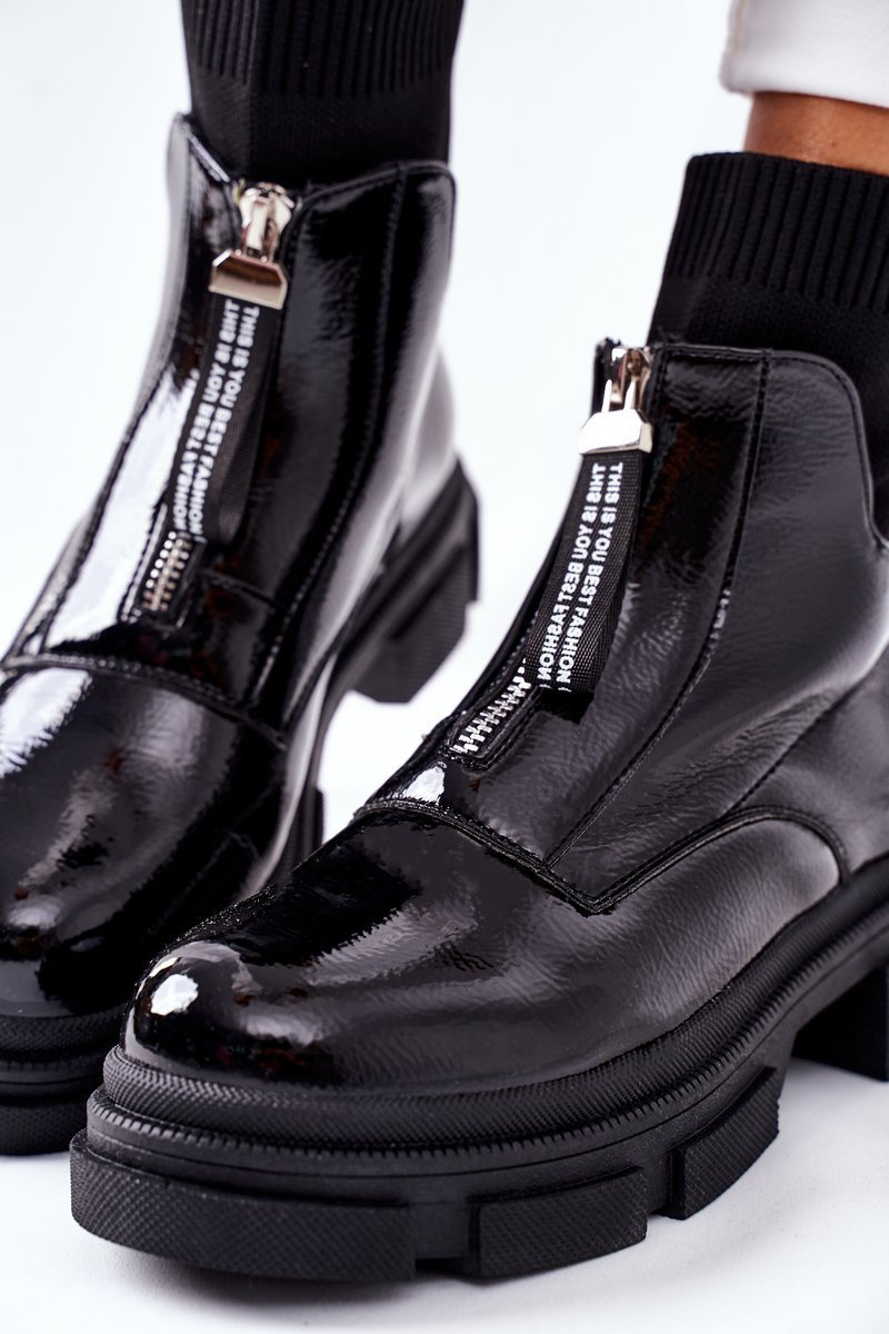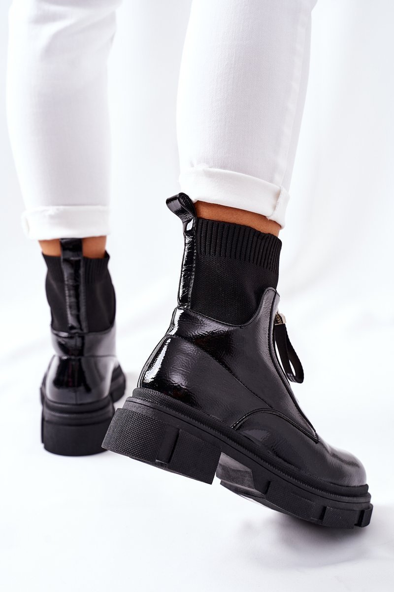 Neobvyklé a stylové boty z lakované ekologické kůže. Masivní platforma stabilizuje vaši chůzi. Svršek je zakončen elastickým materiálem, který se přizpůsobí lýtku. Při výběru velikosti použijte tabulku velikostí.