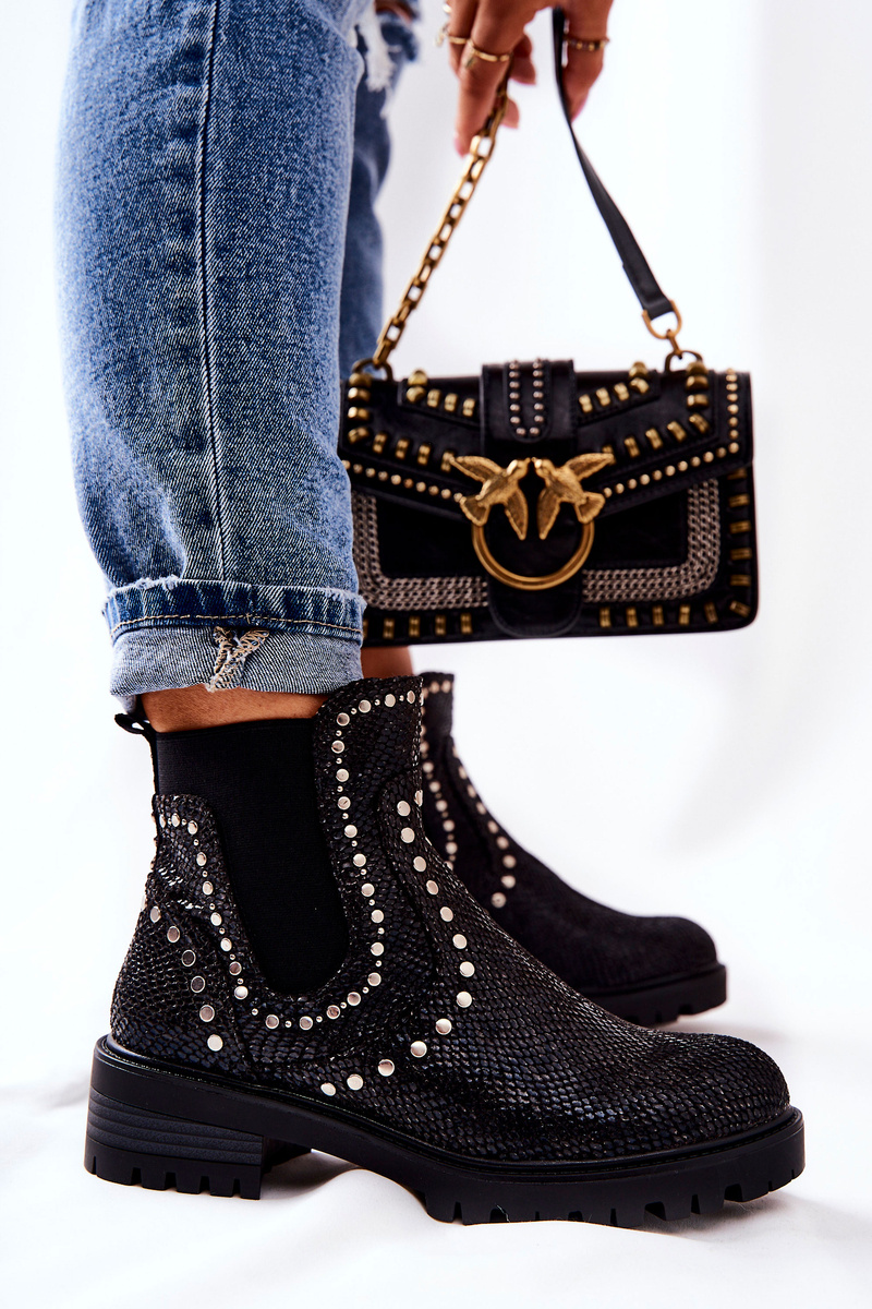 Tlapky z ekologické kůže. S elastickými pásky po stranách svršku a ozdobnými cvočky. Plochý podpatek a podrážka trapper zajišťují stabilitu. Skvěle se hodí k sukním a voskovaným kalhotám. Nezapomeňte se podívat na naše další nabídky! Při výběru velikosti se prosím řiďte tabulkou velikostí.