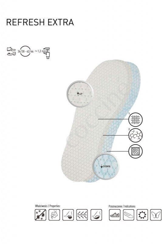 Tenká, neuvěřitelně lehká vložka z celulózových vláken obsahuje osvěžující kapsle s éterickými oleji, což poskytuje pocit pohodlí po celý den. Nohy se nepřehřívají ani neochlazují, zůstávají suché a svěží. Protiskluzová spodní vrstva udržuje vložku na místě. Osvěžující účinek trvá 5-7 dní. Doporučuje se zejména v létě. K běžné výměně, 3 páry v balení. Velikosti: 36/38, 39/41, 42/44 (Trojitá numerace )