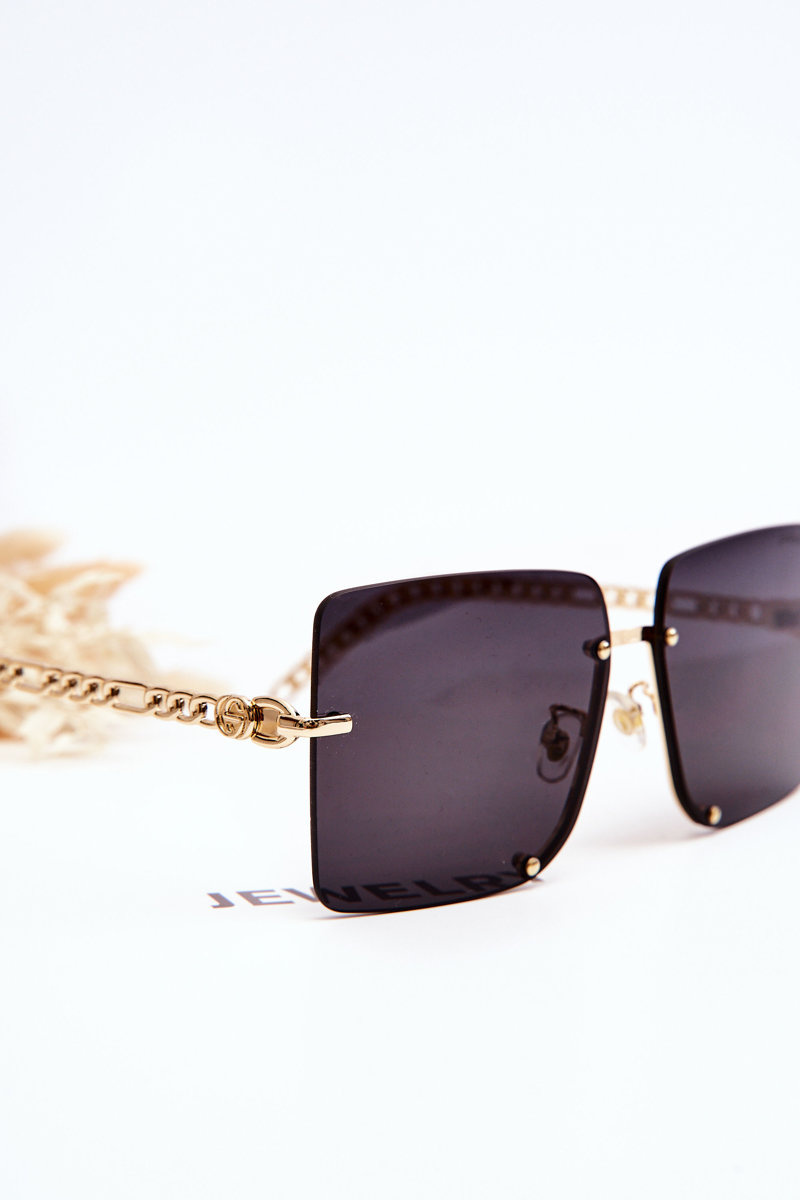 Sluneční brýle jsou perfektní do slunečného počasí díky ochraně očí před zářením. Brýle jsou vyrobeny z kombinace plastu a kovu. Čtvercové čočky nemají rámečky. Módní chrámy napodobují řetízek. Informace od výrobce: UV 400, kategorie 3.