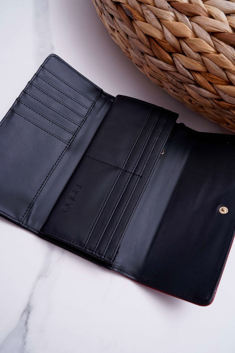 Elegantní dámská peněženka od renomované značky NOBO. Klasický vzor vyrobený z ekologické kůže. Peněženka na zaklapnutí. Uvnitř je prostor pro 12 karet nebo jiných dokumentů a tři přihrádky, z nichž jedna je na zapínání zipem. Peněženka je balena v elegantní černé krabici s logem značky.