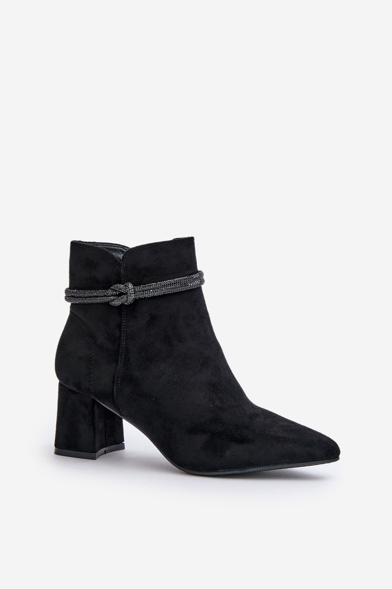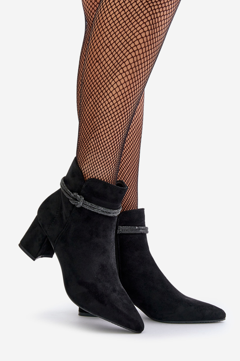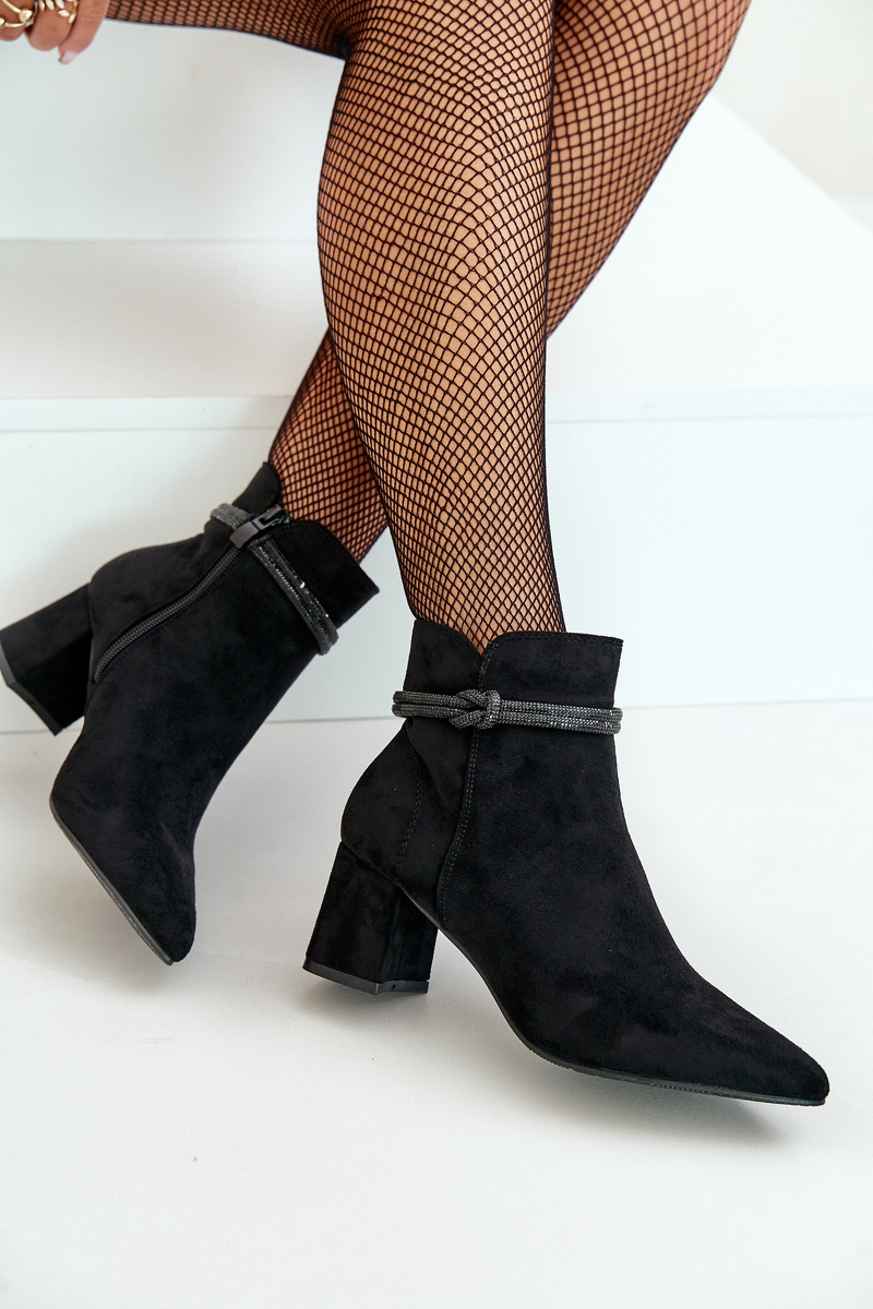 Dámské boty s kotníkovým svrškem. Vyrobené z příjemného na dotek eko semiše. Usazeny na sloupkovém podpatku. Svršek zdobený lesklým páskem. Špičaté špičky opticky prodlouží nohy. Zapínání na zip zaručuje snadné obouvání a svlékání bot, což je obzvláště praktické při každodenním používání. Při výběru velikosti se řiďte tabulkou velikostí.