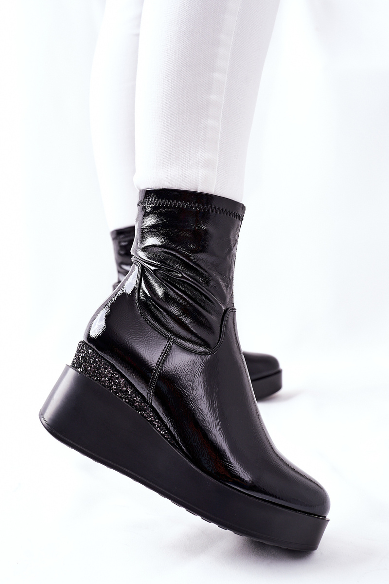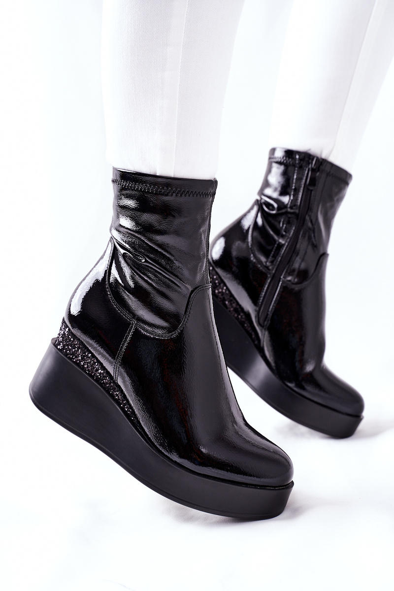 Výjimečné boty z lakované ekologické kůže. Platforma pozvednou vaši siluetu a zaručí pohodlí na nejvyšší úrovni. Boty mají na boku svršku zip pro snadné nazouvání. Podrážka je zdobená jemně třpytivým brokátem. Vnitřní strana je zateplená měkkým kožíškem ve výšce kotníků. Nezapomeňte si prohlédnout celou naši kolekci bot. Při výběru velikosti se prosím řiďte tabulkou velikostí.