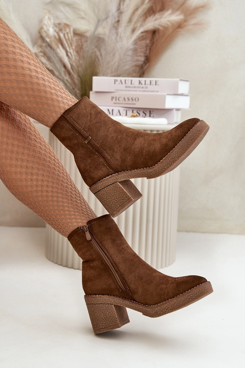 Dámské boty z eko semiše, který je měkký a příjemný na dotek. Jsou umístěny na stabilním sloupkovém podpatku, což zajišťuje pohodlí a jistotu při chůzi po celý den, zatímco přidává několik centimetrů na výšce a zdůrazňuje siluetu. Vnitřek je zateplený obuvnickou dekou, která zajišťuje teplo a komfort v chladnějších dnech, chránících nohy před zimou. Díky zipovému uzávěru je jejich obouvání a svlékání rychlé a bezproblémové, což je velká výhoda při každodenním nošení. Při výběru velikosti se řiďte tabulkou velikostí.