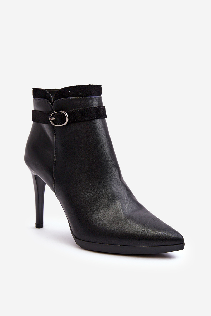 Dámské boty vyrobené z eko kůže. Zapíná se na zip na straně. Osazené na podpatku ve formě špice. Špičky opticky zúží nohy. Horní část je ozdobena tenkým páskem s karabinou. Mají uvnitř zateplení ve formě obuvního kožešiny a vyztužený patník. Skvělý model pro mnoho stylů! Musíš je mít! Při výběru velikosti se řiďte tabulkou velikostí.