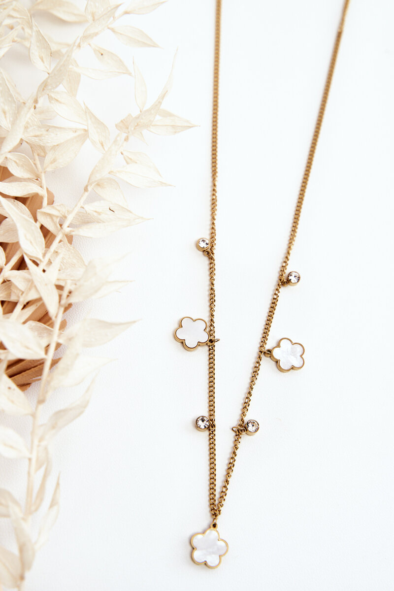Nádherný řetěz je vyroben z nerezové oceli. Má možnost nastavení délky. Náhrdelník má ozdobné prvky v podobě květin a zirkonů. Tento model bude perfektní jako doplněk každodenních stylizací. Rozhodně byste to měli mít!