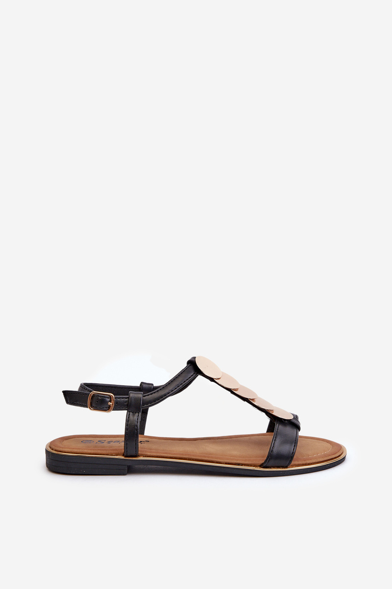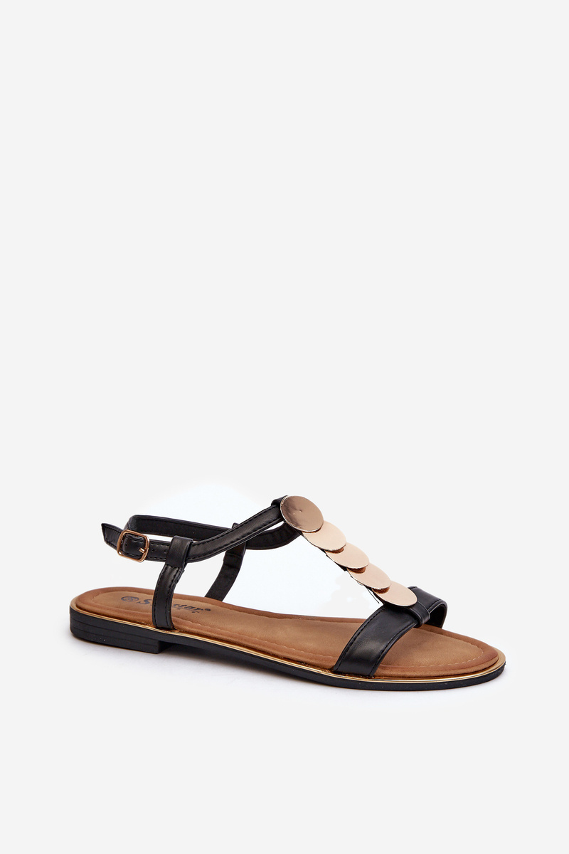 Ploché dámské sandály vyrobené z eko kůže. Ozdobené zlatými detaily. Zapínají se na nastavitelný pásek s přezkou pro ideální přizpůsobení. Tento model si jistě sladíte s mnoha styly! Při výběru velikosti se řiďte tabulkou velikostí.