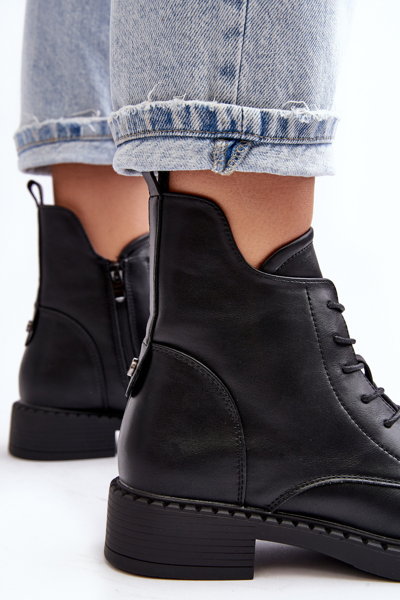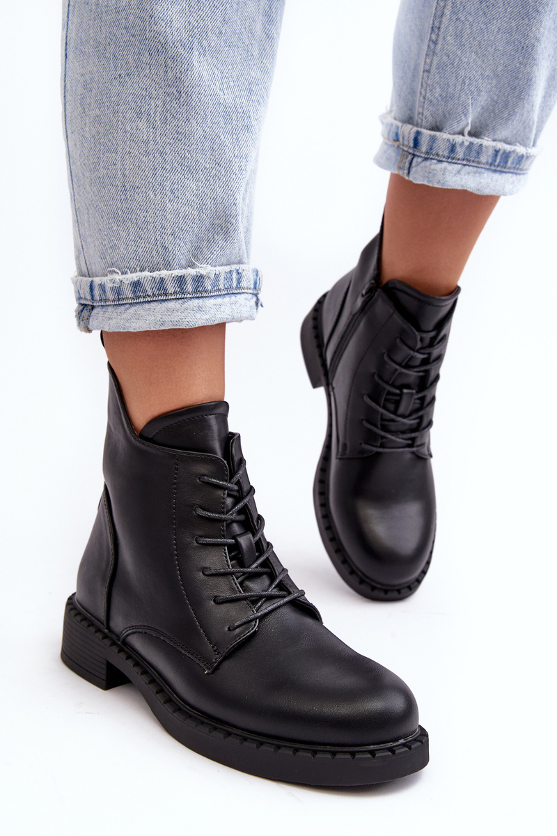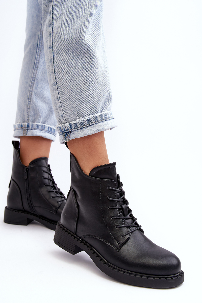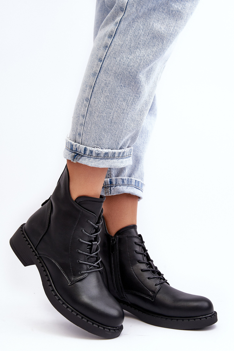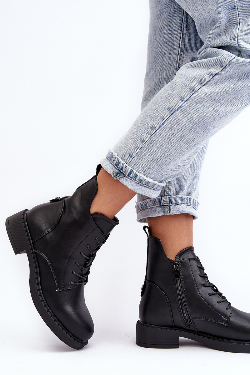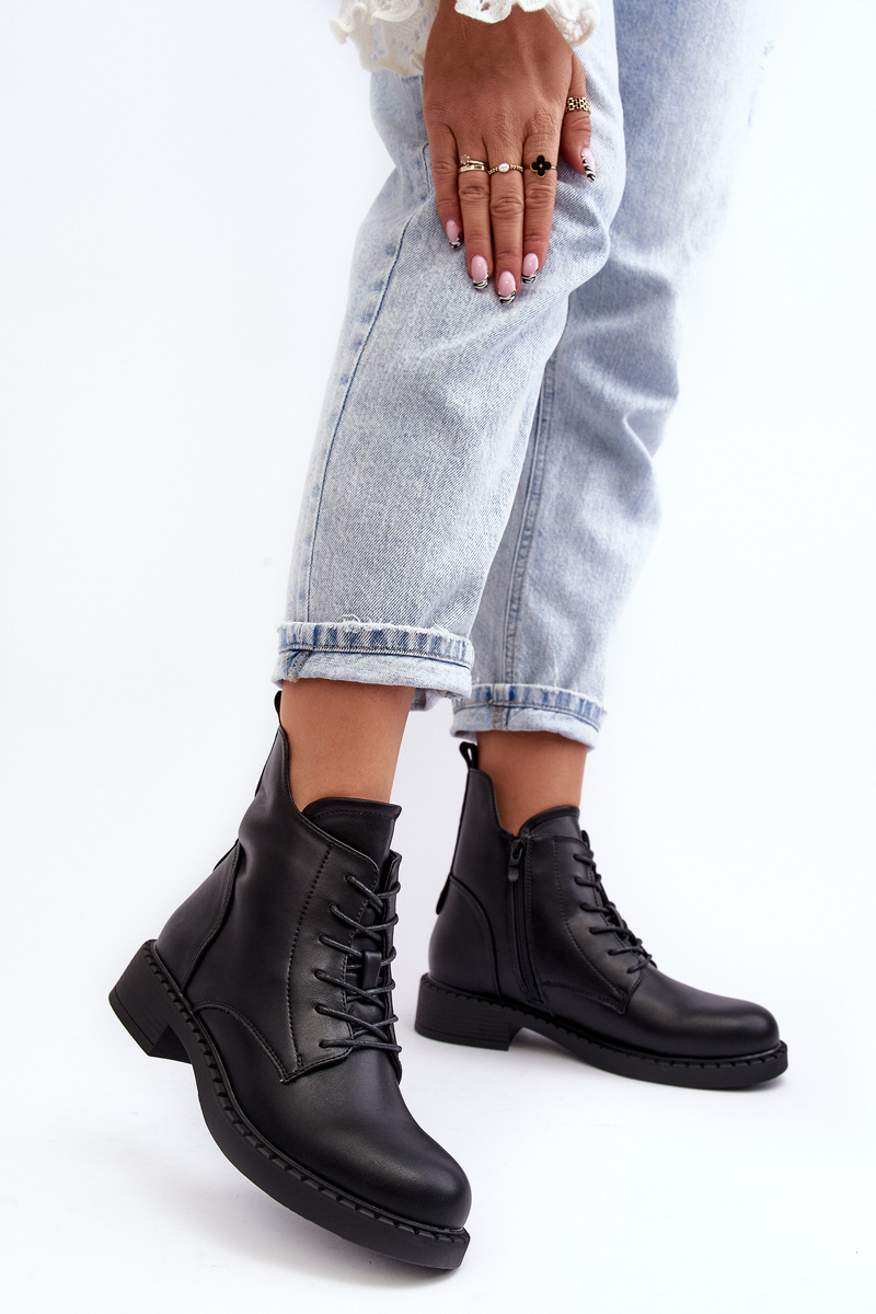 Klasické dámské botky na plochém, stabilním podpatku. Vyrobené z eko kůže, osazené na plochém podpatku. Horní část až ke kotníku s zipem a šněrováním. Špičky zaoblené. Vnitřek oceněný příjemnou kožešinou. Tento model můžete snadno kombinovat s mnoha jarními a podzimními stylizacemi! Určitě je musíte mít! Při výběru velikosti se řiďte tabulkou velikostí.