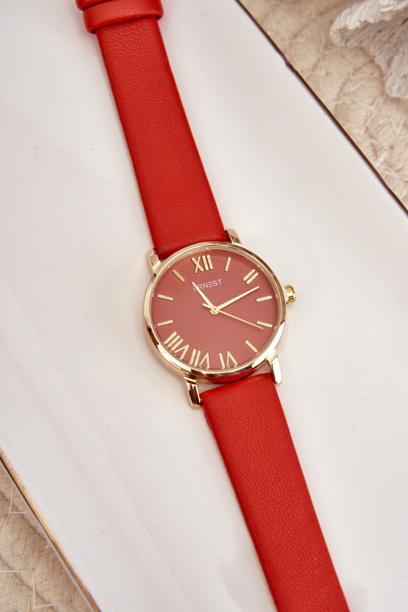 Dámské hodinky značky Ernest. Řemínek vyrobený z ekologické kůže. Jednoduchý, ale výjimečný tvar těchto hodinek je činí ideálním doplňkem jak pro každodenní, tak i formálnější příležitosti. Díky své univerzálnosti a eleganci vždy bude jemným doplňkem každého oblečení.
