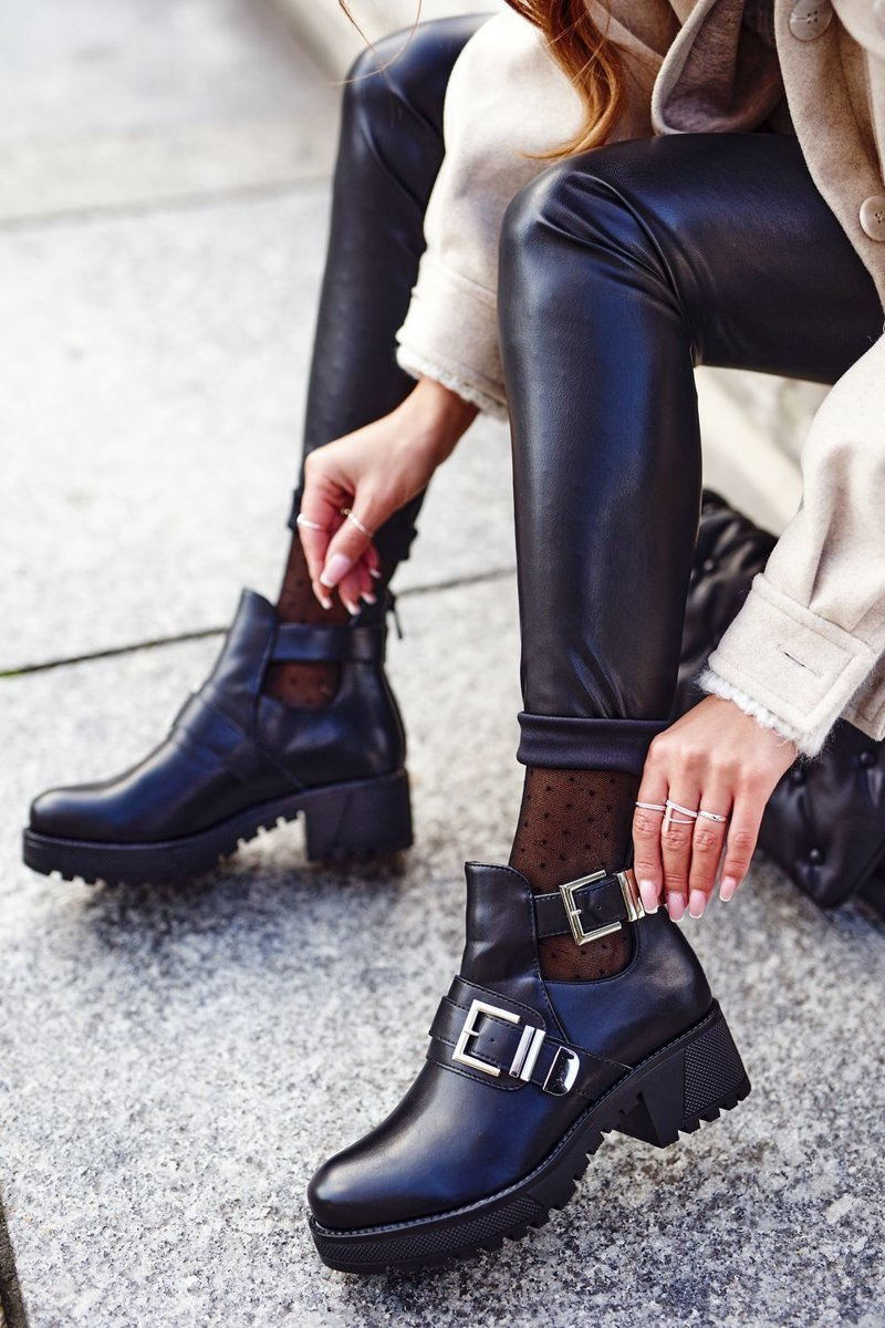 Exkluzivní dámské boty! Vyrobeno z ekologické kůže, zdobené sponami. Zapínání na zip. Jsou umístěny na jemném podpatku, který zvedne vaši postavu. Získejte trochu mimořádný vzhled! Při výběru si zkontrolujte tabulku velikostí.