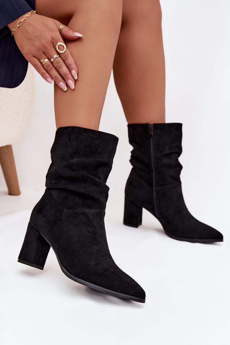 Dámské boty z eko semiše jsou elegantní a módní volbou na podzim a zimu. Sedí na stabilním podpatku typu sloupek, který krásně zeštíhluje postavu, a špičaté špičky dodávají celku ženský charakter. Vršek s mačkáním dodává stylový, moderní vzhled a praktický zip usnadňuje obouvání. Vnitřek vyhřátý kožešinou zajišťuje pohodlí a teplo v chladnějších dnech. Tento model se skvěle hodí jak pro každodenní, tak pro elegantní stylizace. Při výběru velikosti se řiďte tabulkou velikostí. Při výběru velikosti se řiďte tabulkou velikostí.