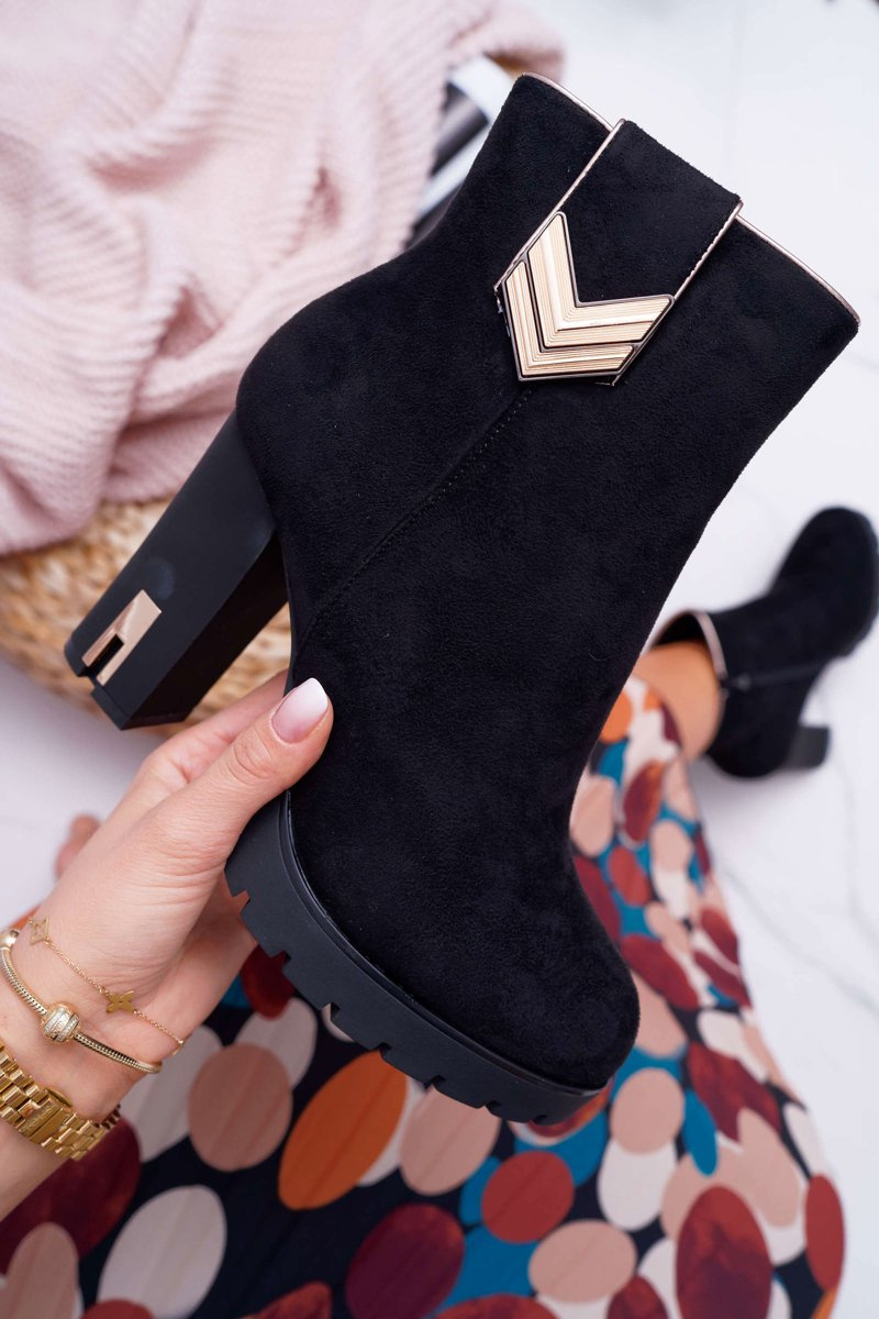 Skvělé boty v klasické černé barvě. Svršek je vyroben z ekologického semiše, zdobený zlatým plíškem a zlatým lemováním. Postranní zip usnadňuje nazouvání. Vnitřek je zateplen na dotyk příjemnou kožešinou s krátkým vlasem. Zdobený matný černý podpatek zvedne a zvýrazní vaši postavu. Při výběru si zkontrolujte tabulku velikostí.