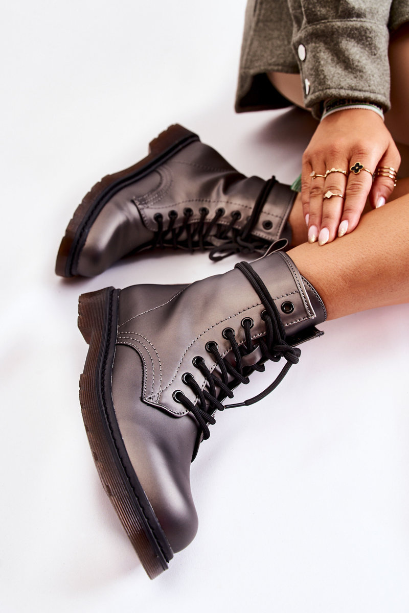 Dámské kotníkové boty jsou vyrobeny z plastu. Tento model má vyztuženou patu. Kozačky zavazované kulatými tkaničkami. Nasazené na nízké platformě a plochém podpatku z gumového materiálu. Jsou protiskluzové. Uvnitř mají izolaci v podobě přikrývky na obuv. Podívejte se také na další modely bot! Při výběru velikosti se řiďte tabulkou velikostí.