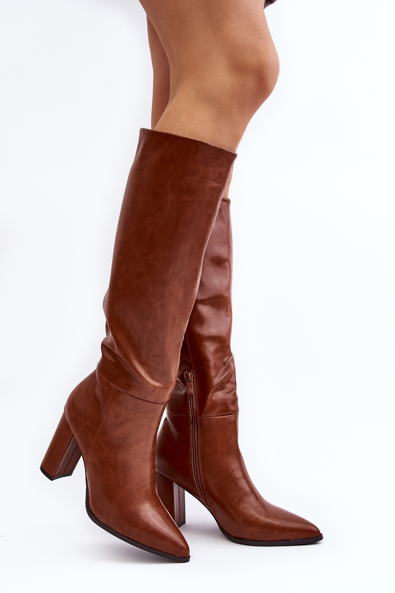 Dámské kozačky s kolenní šněrovací botou. Vyrobeno z ekokože. Sloupková pata. Špičaté špičky opticky zjemní nohy. Model se zavazováním na zip. Tento elegantní střih se hodí k šatům, sukním nebo kalhotám! Při výběru velikosti se řiďte tabulkou velikostí.