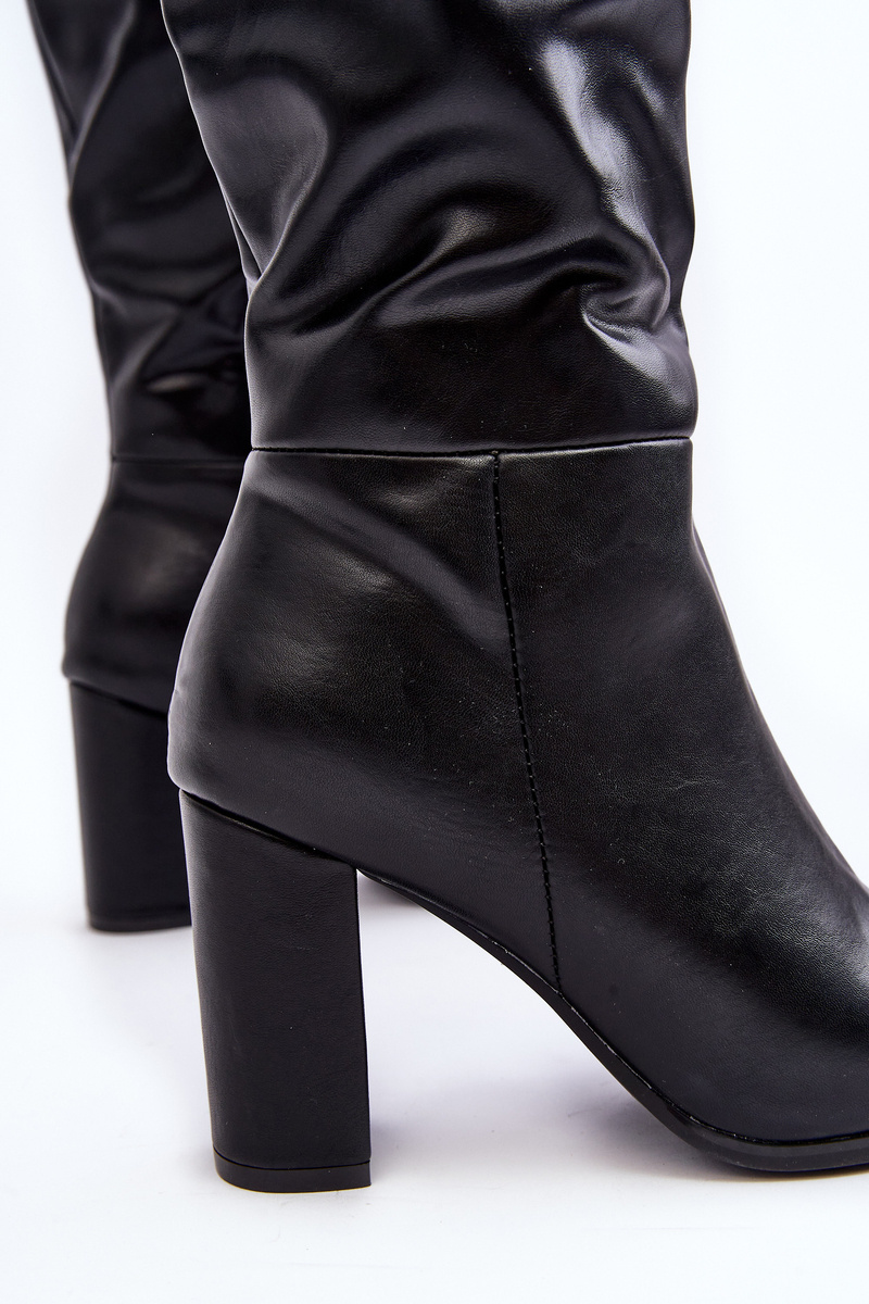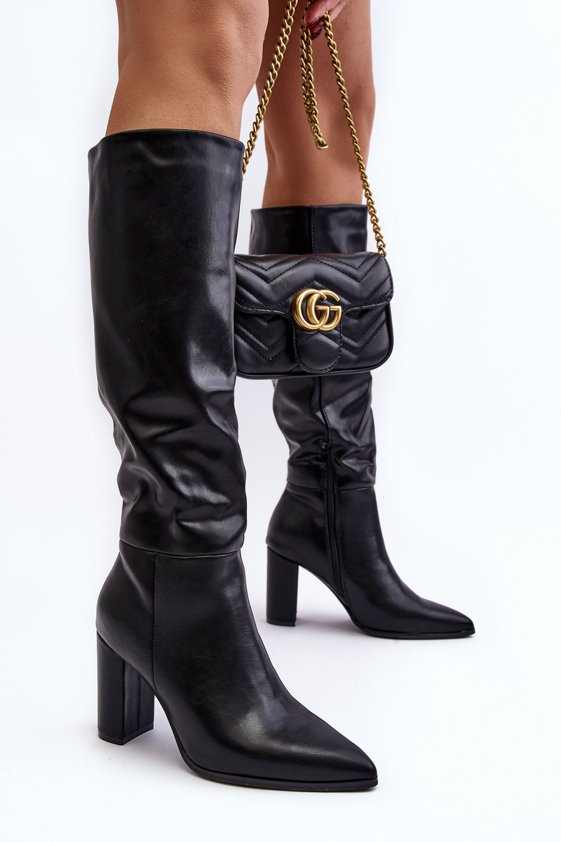 Dámské kozačky s kolenní špičkou. Vyrobeno z ekokože. Sloupková pata. Špičaté špičky opticky prodlouží nohy. Model se zasouvá s dalším zipem. Tento elegantní střih se hodí k šatům, sukním nebo kalhotám! Při výběru velikosti se řiďte tabulkou velikostí.