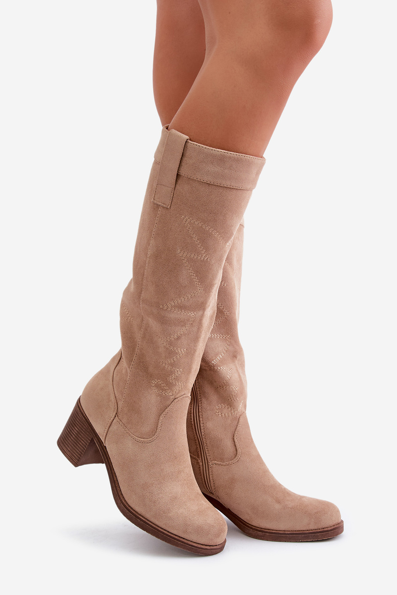Dámské kozačky pod koleno vyrobené z eko semiše. Umístěny na podpatku ve formě nízkého sloupku. Špičky jsou zaoblené. Svršek zdobený prošíváním. Model se zapíná na zip. Skvělé pro podzimní styly! Při výběru velikosti se řiďte tabulkou velikostí.
