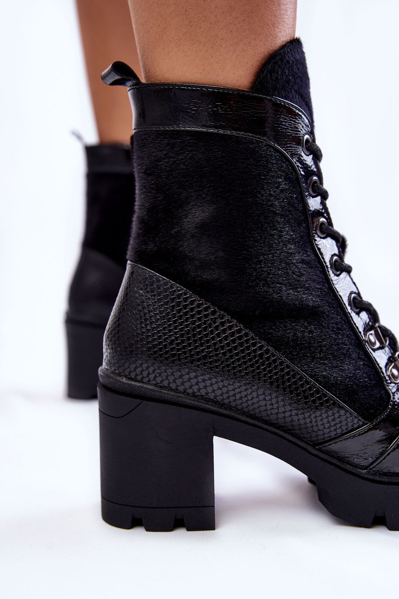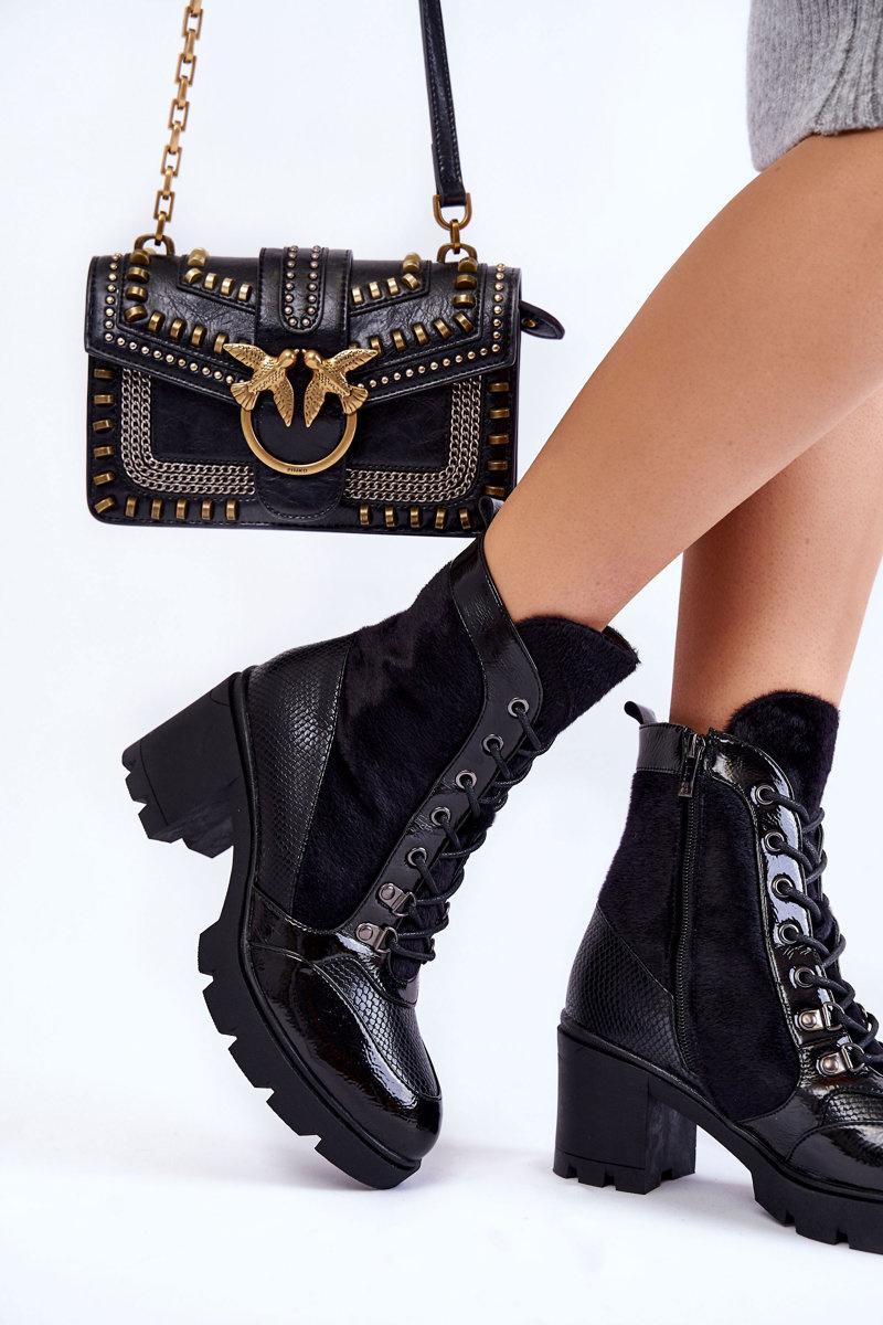 Boty Laura Fiore budou perfektní během podzimní sezóny. Vyrobeno z vysoce kvalitní eko kůže v kombinaci s vložkou z eko koňských žíní. Boty jsou nasazeny na podpatku ve formě sloupku a platformy s drážkami. Uvnitř zateplené jemným kožíškem. Tento model má klasické šněrování a zip na boční straně svršku. Při výběru velikosti použijte tabulku velikostí.