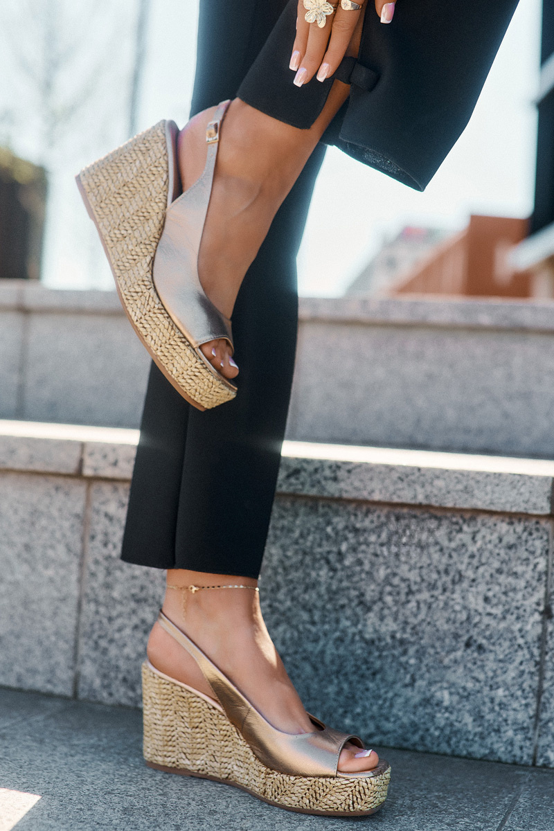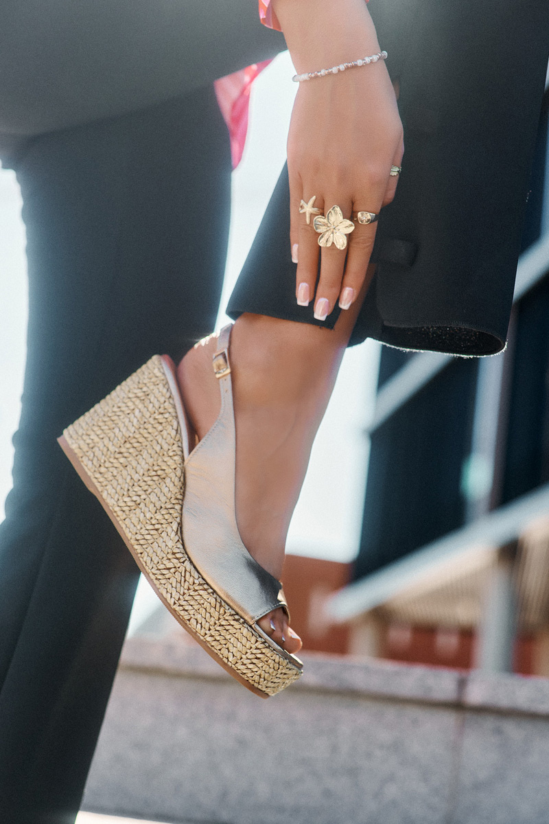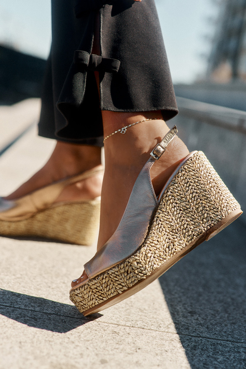 Dámské sandály vyrobené z přírodní kůže jsou elegantním návrhem na letní dny. Uloženy na platformě a klínu zdobeném pletením, kombinují komfort s módním vzhledem. Zapínají se na přezku s nastavitelným páskem, což umožňuje dokonalé přizpůsobení noze a zajišťuje pohodlí po celý den. Tyto sandály budou vynikající volbou pro elegantní a neformální stylizace, dodávající jim jedinečný charakter. Při výběru velikosti se řiďte tabulkou velikostí.