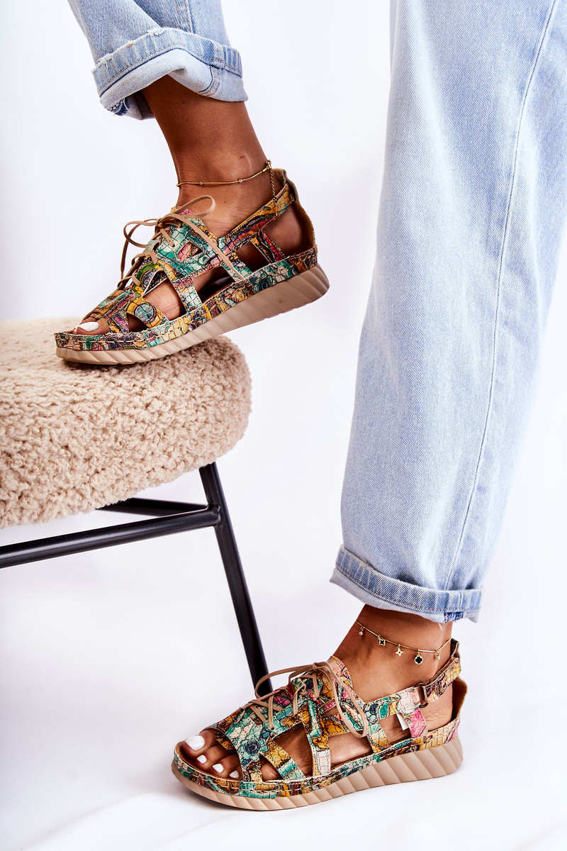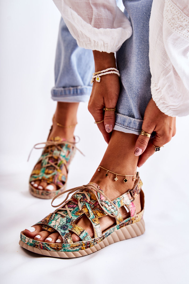 Dámské sandály jsou vyrobeny z přírodní kůže s módním vzorem. Model se zapíná na suchý zip na boku svršku a také zavazuje. Měkká stélka je vyrobena z přírodní kůže a je extrémně pohodlná. Sandály jsou nasazeny na jemné platformě. Plastová podrážka. Nos je otevřený, zaoblený. Model bude perfektní v horkých dnech! Při výběru velikosti použijte tabulku velikostí.