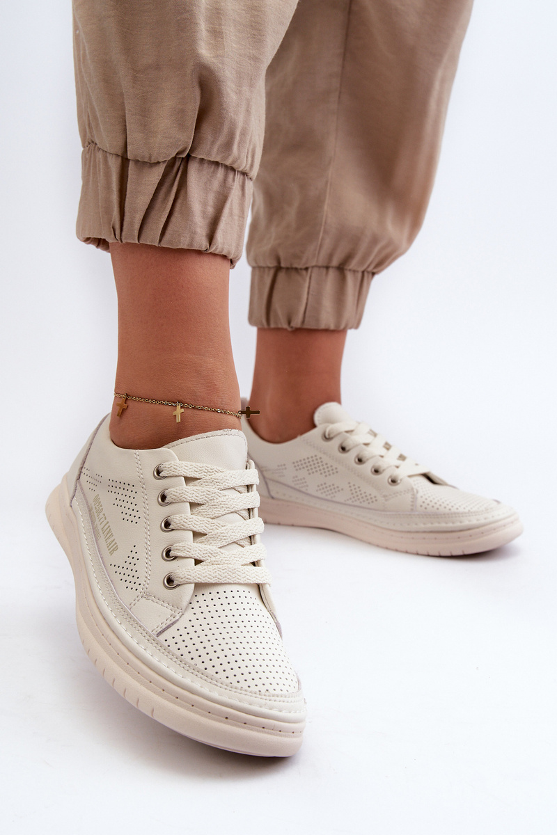 Tenisky na podrážce z pryžového materiálu v klasickém střihu. S nízkým svrškem před kotník. Model uvázaný na kulaté tkaničky. Vyrobené z přírodní, měkké kůže s perforací, což zajišťuje, že jsou mimořádně prodyšné a pohodlné při nošení. Pohodlná stélka je také vyrobena z přírodní kůže. Skvěle se hodí k běžným stylizacím, zejména k džínům nebo kraťasům. Lehké a stylové - měla byste je mít ve své skříni! Při výběru velikosti se řiďte tabulkou velikostí.