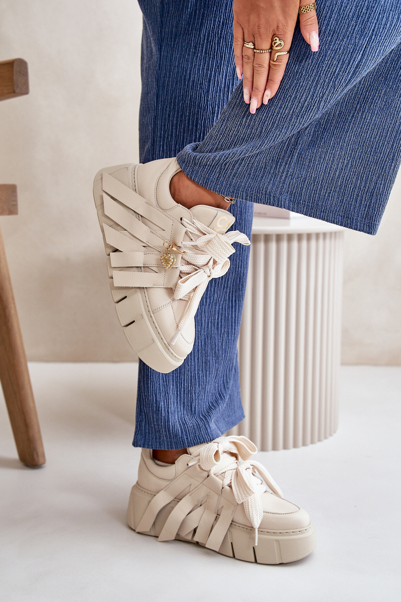 Dámské tenisky vyrobené z vysoce kvalitní přírodní kůže jsou nabídkou pro milovnice elegance spojené s moderním designem. Uloženy na masivní platformě, tyto boty dodávají nejen výšku, ale i výrazný charakter každému stylingu. Model se vyznačuje unikátním, silným šněrováním, které je navíc ozdobeno dvěma půvabnými srdíčky, dodávajícími celku jemný, romantický akcent. Ideální jak pro neformální, tak pro odvážnější, streetwearové outfity, tyto tenisky spojují komfort nošení a jedinečný styl. Při výběru velikosti se řiďte tabulkou velikostí.