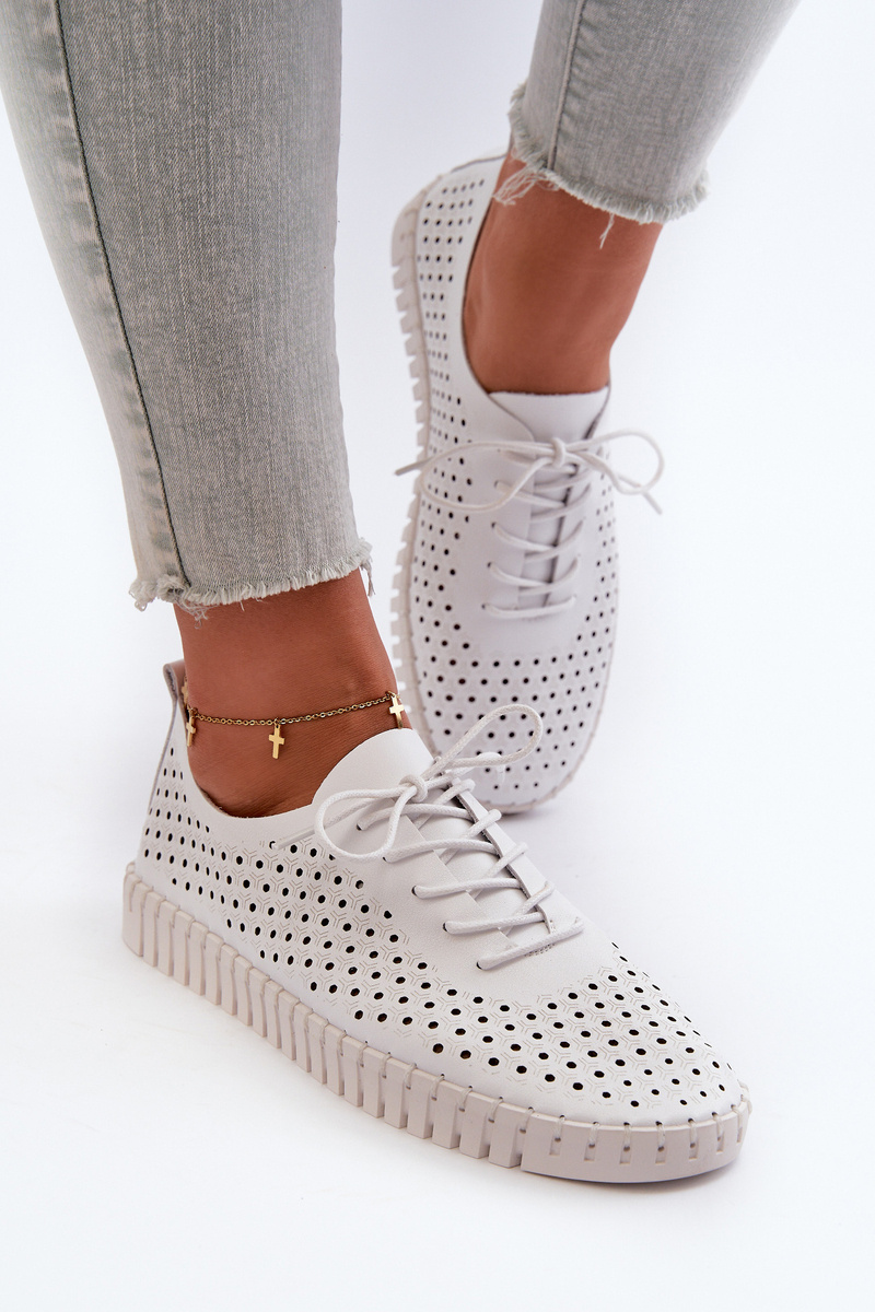 Dámské tenisky vyrobené z přírodní kůže, zdobené vyřezávaným vzorem. Tyto stylové boty poskytují pohodlí a prodyšnost, ideální na teplé dny. Skvělé spojení módy a funkčnosti, skvěle se hodí do každodenních stylizací. Při výběru velikosti se řiďte tabulkou velikostí.
