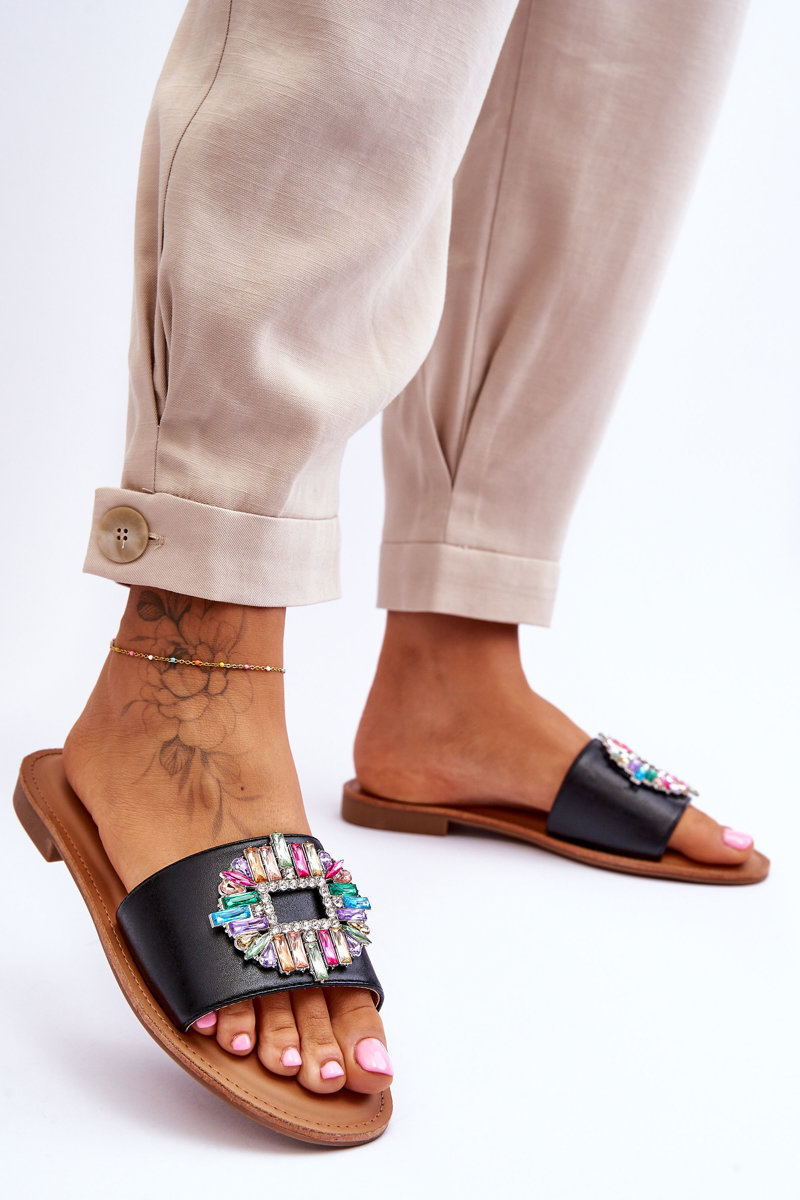 Dámské, módní pantofle klasického střihu jsou vyrobeny z eko kůže. Ozdoba v podobě krystalů různých velikostí dodává žabkám opravdu výjimečný vzhled. Měkká stélka se pohodlně používá a je vyrobena také z eko kůže. Nos je otevřený, mírně zaoblený. Žabky jsou nasazeny na plochém podpatku, díky čemuž se pohodlně používají. Při výběru velikosti se prosím řiďte tabulkou velikostí.