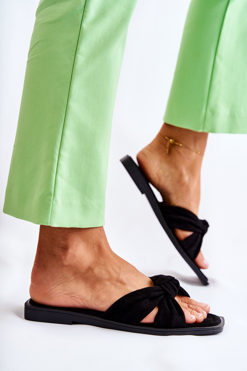 Klasické dámské pantofle jsou vyrobeny z eko semiše příjemného na dotek. Pruhy chlopní se vpředu spojují a tvoří uzel. Stélka je prošívaná a rovněž vyrobena z eko semiše. Pantofle na plochém podpatku. Model, který bude perfektní pro každodenní aktivity, například při nakupování nebo procházce. Tyto pantofle mají otevřenou hranatou špičku. Při výběru velikosti použijte tabulku velikostí.