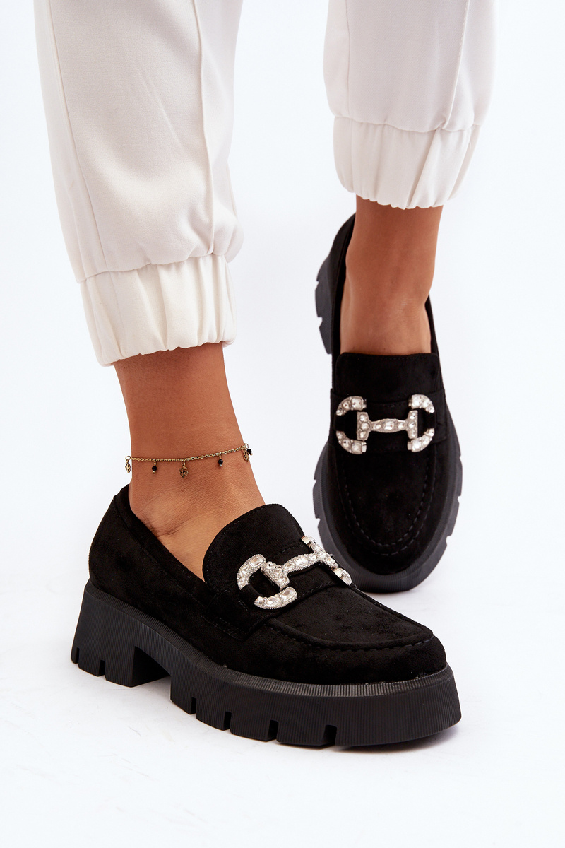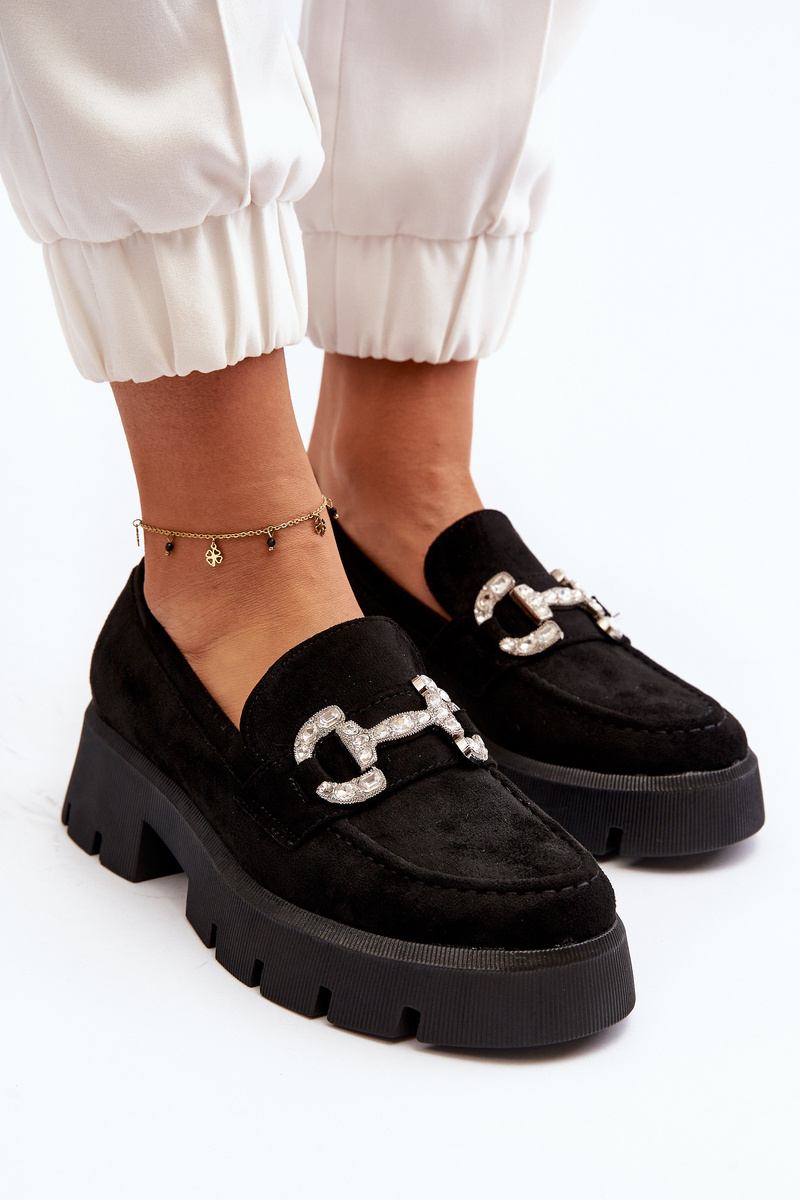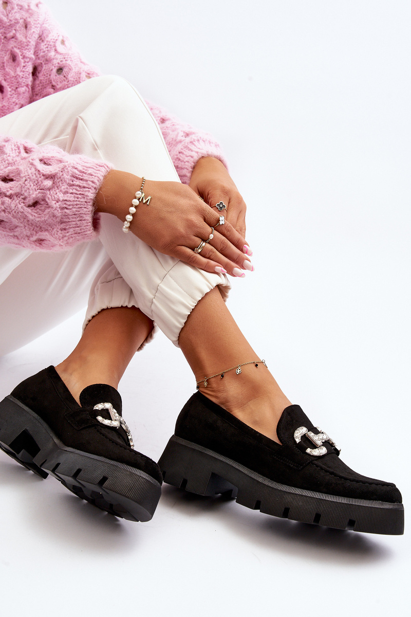 Moderní dámské mokasíny vyrobené z ekologického semiše. V přední části mají ozdobu a pásek. Tento model je osazen na masivní, ploché podrážce a platformě. Mokasíny mají vložku z měkké ekokože. Skvělý model na jaro-podzimní sezónu! Určitě by sis je měla pořídit! Při výběru velikosti se řiďte tabulkou velikostí.
