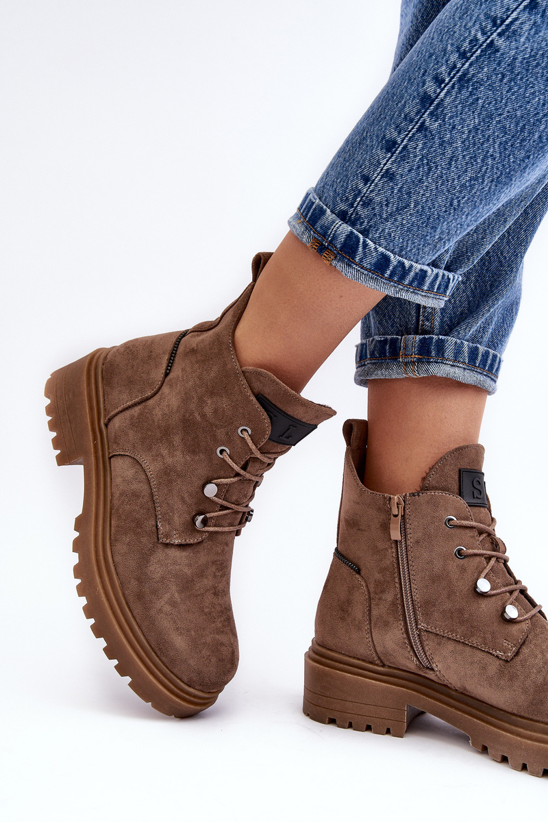 Boty pro ženy s krajkovou kotníkovou střihou jsou vyrobeny z eko suede. Na plochém a stabilním podpatku s vyřezáváním. Vnitřek zateplený tlustým kožešinou. Navíc mají zpevněnou špičku. Model s zipem na straně kotníku a šněrováním. Dámské boty s klasickým střihem budou skvělé na podzimní, chladné dny. Při výběru velikosti se řiďte tabulkou velikostí.