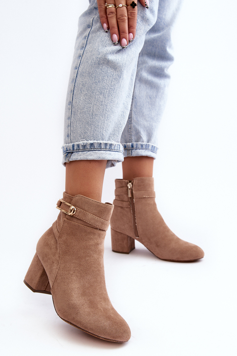 Dámské boty s kotníkovým lemem. Nízká podpatková konstrukce. Vyrobeno z ekologického semiše. Zapínání na zip. Špička je zaoblená. Vnitřek je zateplen kožešinou obuvnickou. Na vrchu kotníku jsou dva tenké proužky. Navíc má tento model zesílenou patku. Při výběru velikosti se řiďte tabulkou velikostí.