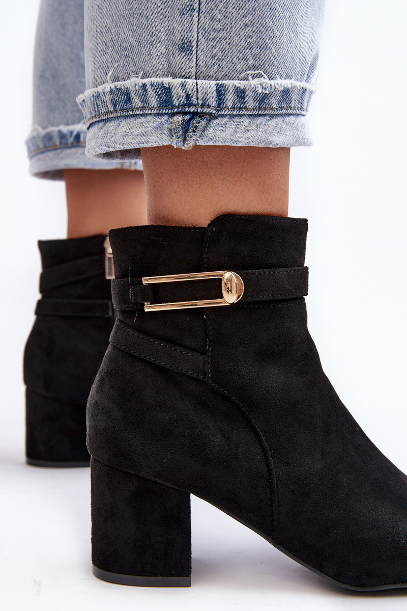 Dámské boty s kotníkovou patou. Osazené na nízkém podpatku. Vyrobené z eko semiše. Zapínání na zip. Špičky zaoblené. Vnitřek zateplený obuvnickou kožešinou. Na horní straně kotníku dva tenké pásky. Navíc tento model má vystouplý špičku. Při výběru velikosti se řiďte tabulkou velikostí.