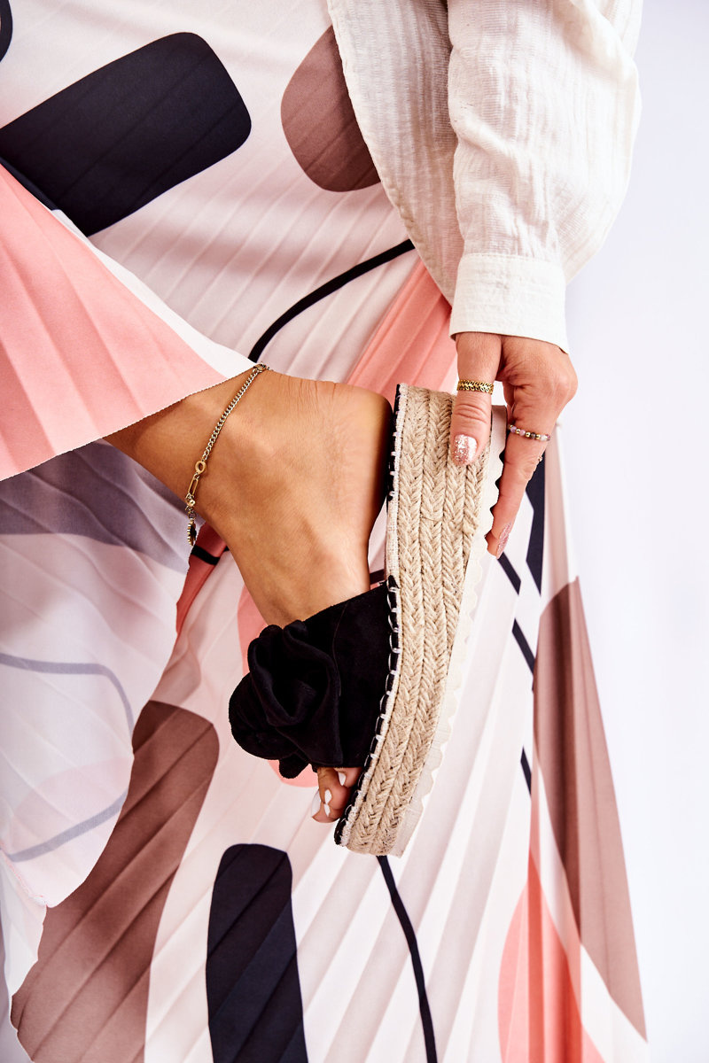 Pohodlné pantofle vyrobené z vysoce kvalitního ekologického semiše. Stélka je vyrobena z kombinace eko semiše a tkaniny. Boty namontované na platformě s klínem. Dodatečně zdobené jutovým prýmkem. Na předním pásku je roztomilá mašlička. Plastová podrážka. Perfektní model pro každodenní použití. Rozhodně byste to měli mít! Při výběru velikosti použijte tabulku velikostí.