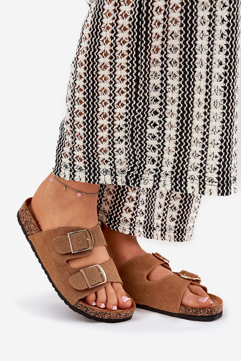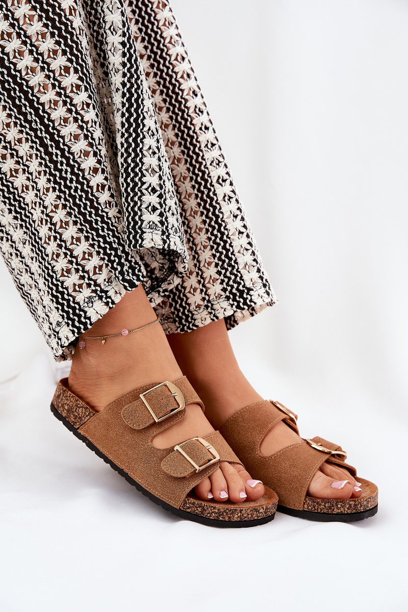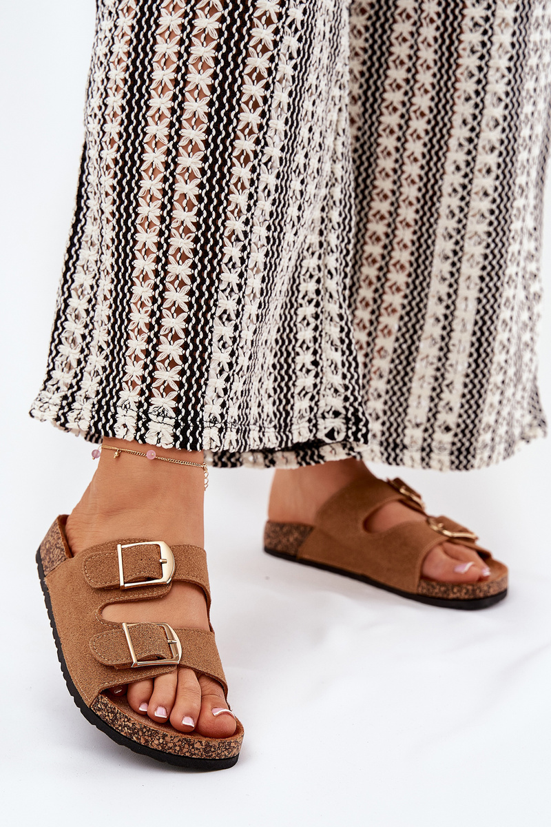 Stylové dámské pantofle na korkové platformě, které kombinují pohodlí s módním vzhledem. Vpředu se nacházejí dva pásky s přezkami, které zajišťují dokonalé přizpůsobení. Profilovaná eko semišová stélka zaručuje komfort po celý den. Tyto pantofle budou skvělou volbou na letní dny, skvěle se hodí k šatům, sukním a kalhotám. Při výběru velikosti se řiďte tabulkou velikostí.