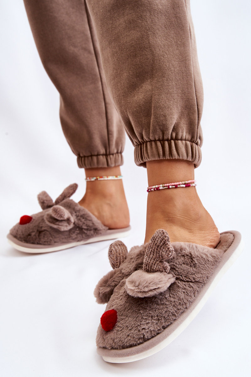 Krásný model dámských pantoflí by vám měl přijít domů! Vyrobeno z měkkého, kožešinového materiálu. Zdobené parohy, ušima a nosem z látky. Klasický nazouvací model je uvnitř zateplený kožešinou. Pantofle byly umístěny na gumové platformě. Skvělý model pro mrazivé dny! Při výběru velikosti se řiďte tabulkou velikostí.