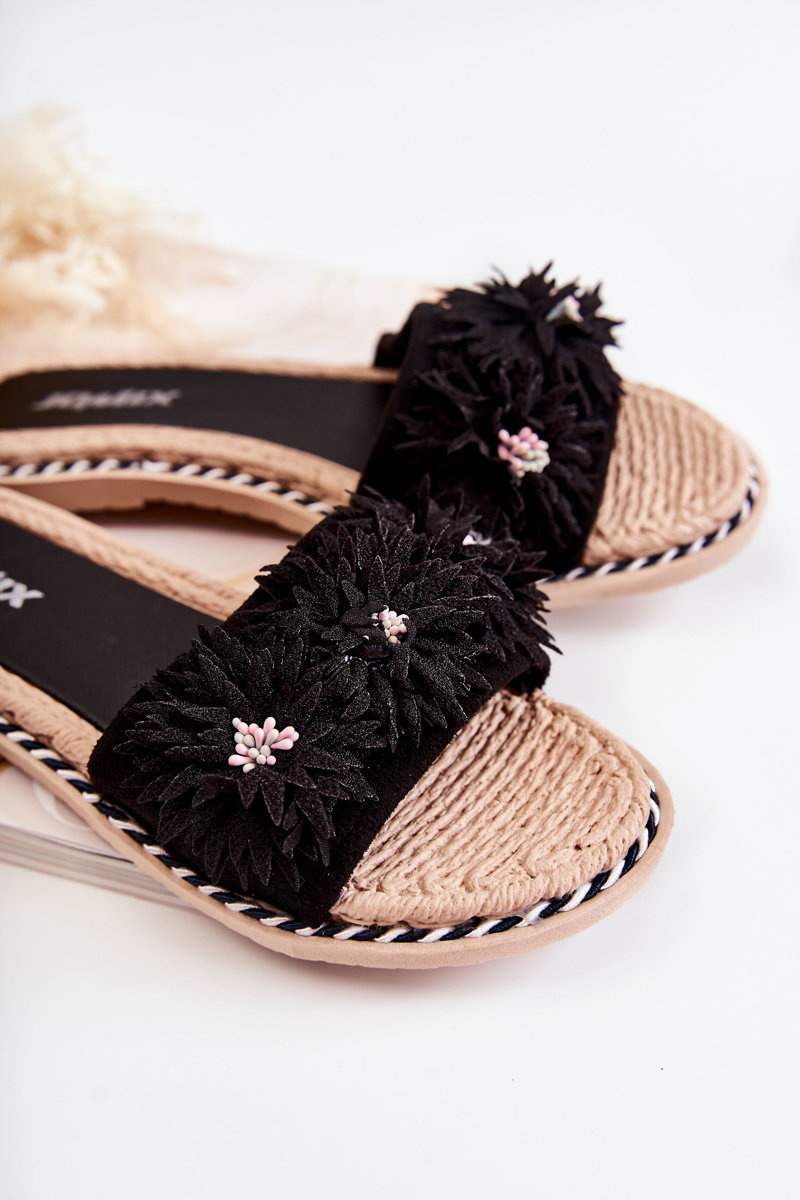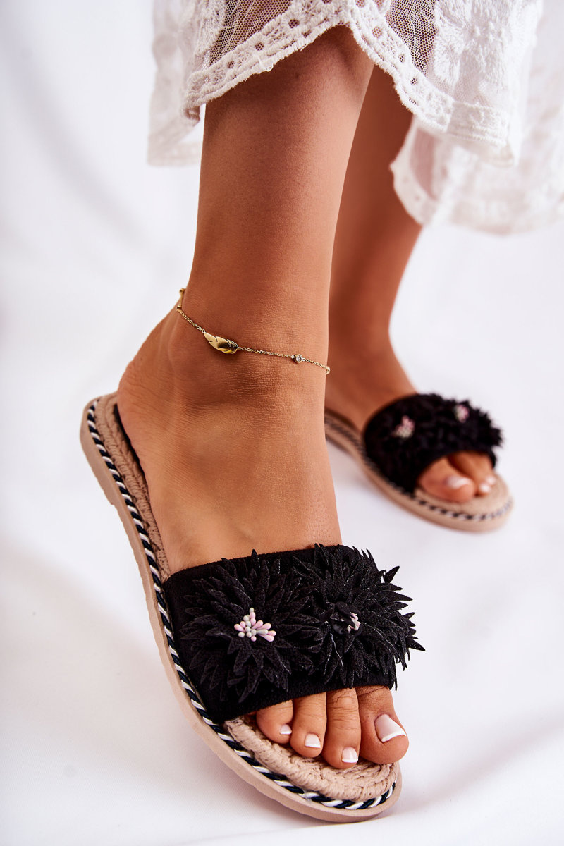 Klasické pantofle s krásnými ozdobnými květinami na přední straně. Vyrobeno z textilního materiálu. Stélka a podešev jsou vyrobeny z pryžového materiálu. Žabky nasazené na plochém podpatku, díky kterému se velmi pohodlně používají. Módní střih s otevřenou, kulatou špičkou. Ozdobná šňůrka kolem podrážky. Při výběru velikosti použijte tabulku velikostí.