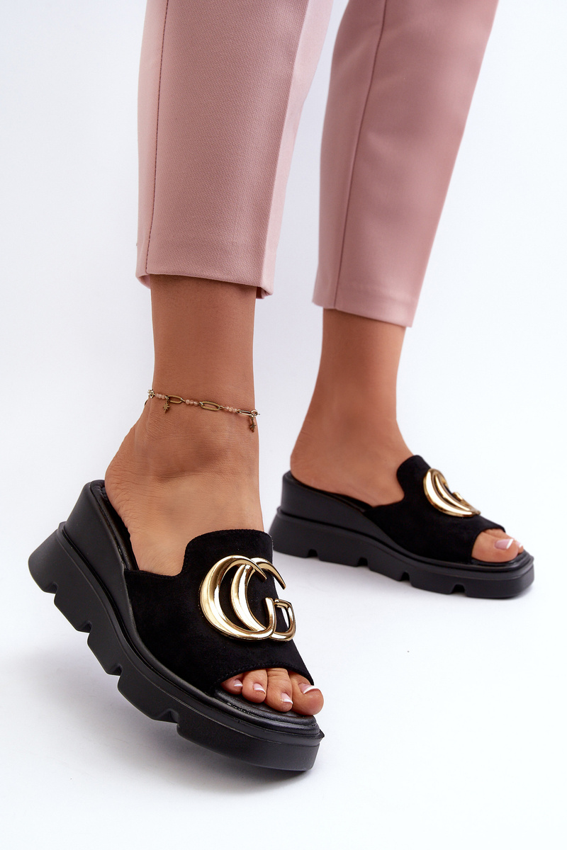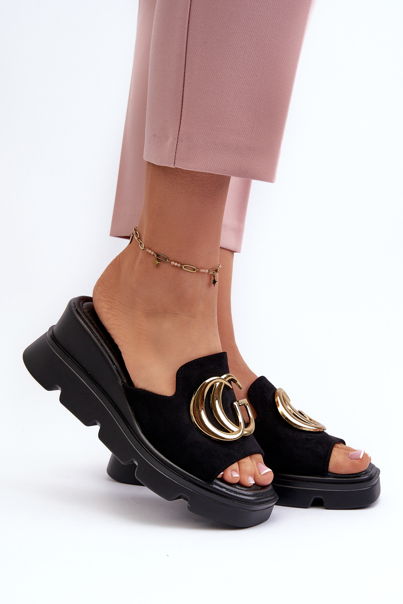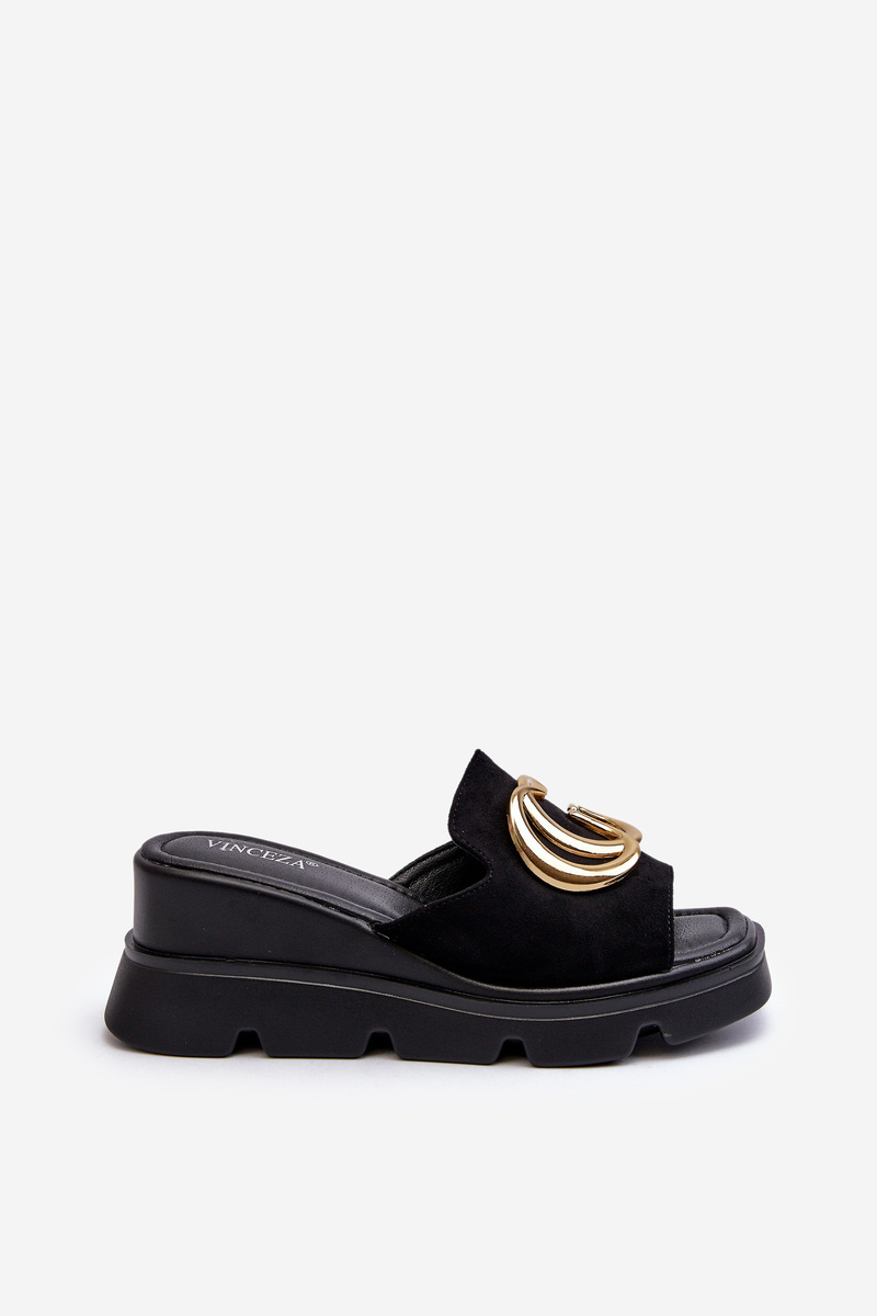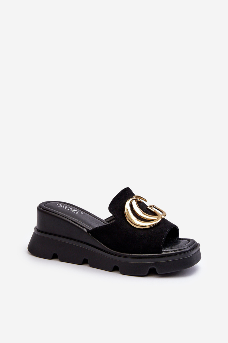 Dámské Pantofle Z Eko Semiše Na Klínu A Platformě Se Zlatou Dekorací Vinceza 58295 Černé