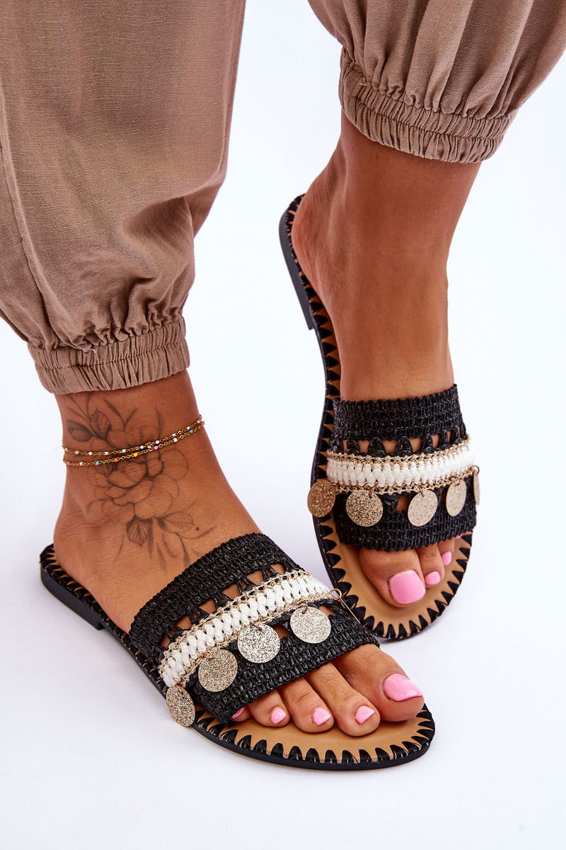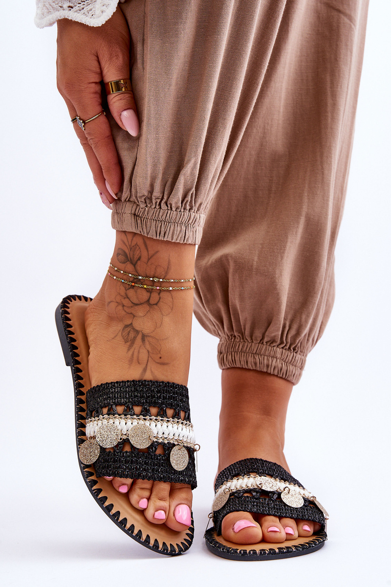 Módní, dámské pantofle jsou vyrobeny z kombinace plastu a látky. Tento model má ozdobná kolečka a lurex, tedy lesklou nit. Klasický slip-on model s plochým podpatkem a protiskluzovou podrážkou. Vložka z ekokůže je také zdobena nití. Při výběru velikosti se prosím řiďte tabulkou velikostí.