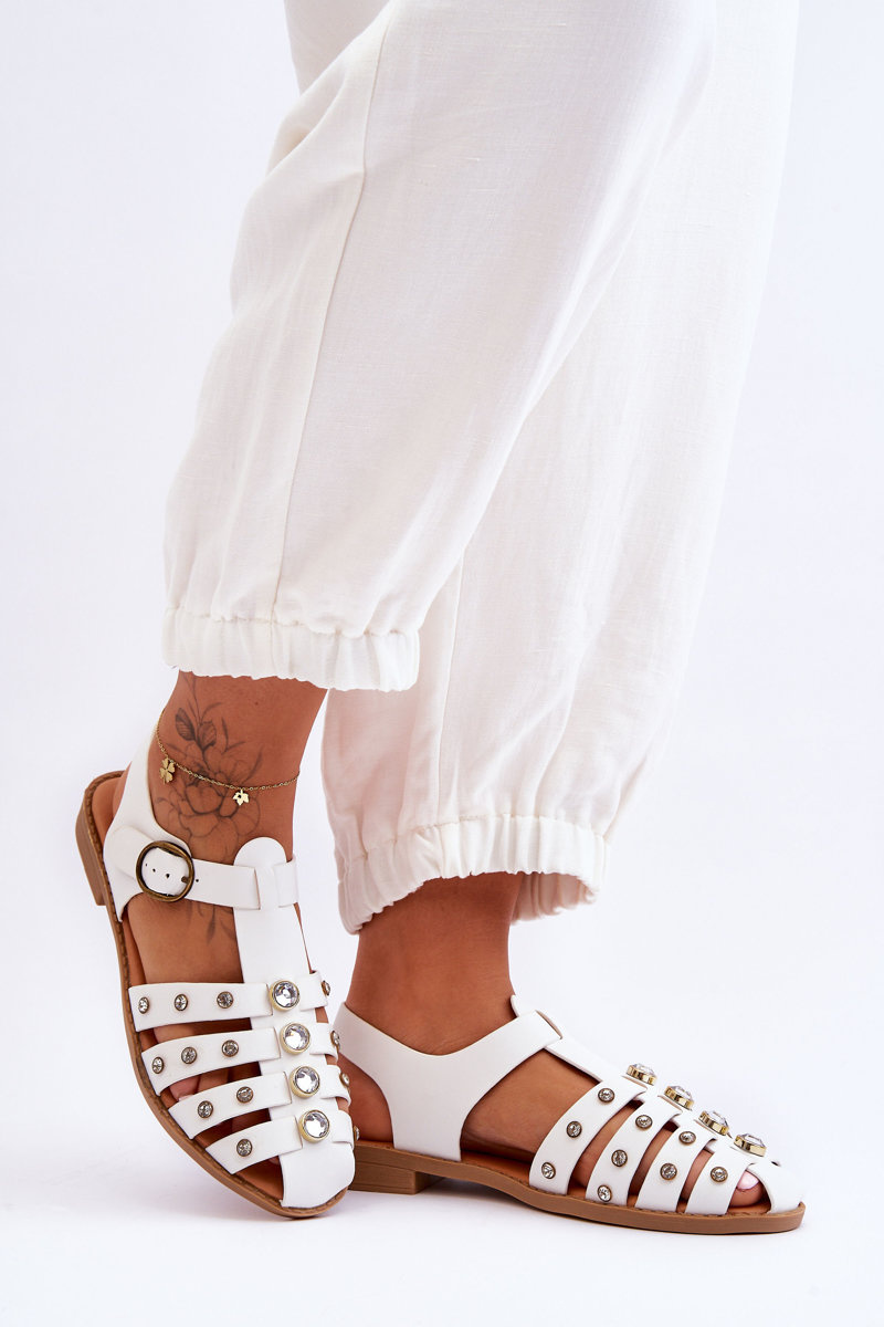 Dámské sandály jsou vyrobeny z eko kůže. Tento model má na celém svršku ozdobné trysky imitující zirkony. Klasické zapínání pomocí nastavitelného popruhu s přezkou. Vložka je měkká a pohodlná při používání. Tento extrémně vzdušný model je jako stvořený pro horké letní dny! Sandály jsou nasazeny na plochém podpatku s protiskluzovou podrážkou. Při výběru velikosti se prosím řiďte velikostní tabulkou.