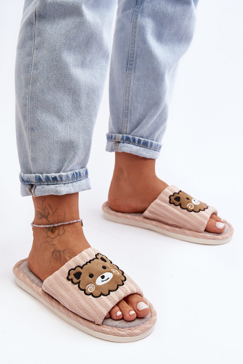 Dámské pantofle vyrobené z textilního materiálu. Vsazené na ploché, gumové podrážce. Vepředu jsou nasazeny medvídci. Otevřené špičky. Ideální na relaxaci v domácím útulku! Při výběru velikosti se řiďte tabulkou velikostí.
