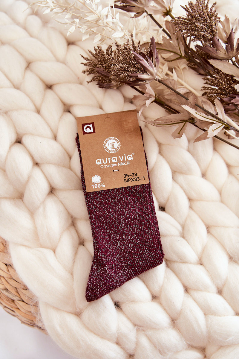 Módní dámské ponožky jsou vyrobeny z bavlněné tkaniny s přídavkem lurexu, tedy metalické nitě. Tyto ponožky jsou bez tlaku. Model je mírně žebrovaný, nad kotníkem. Tyto ponožky jsou perfektní jako doplněk ke každodennímu stylingu s povalečovými botami. Tento model by rozhodně neměl chybět ve vašem šatníku!