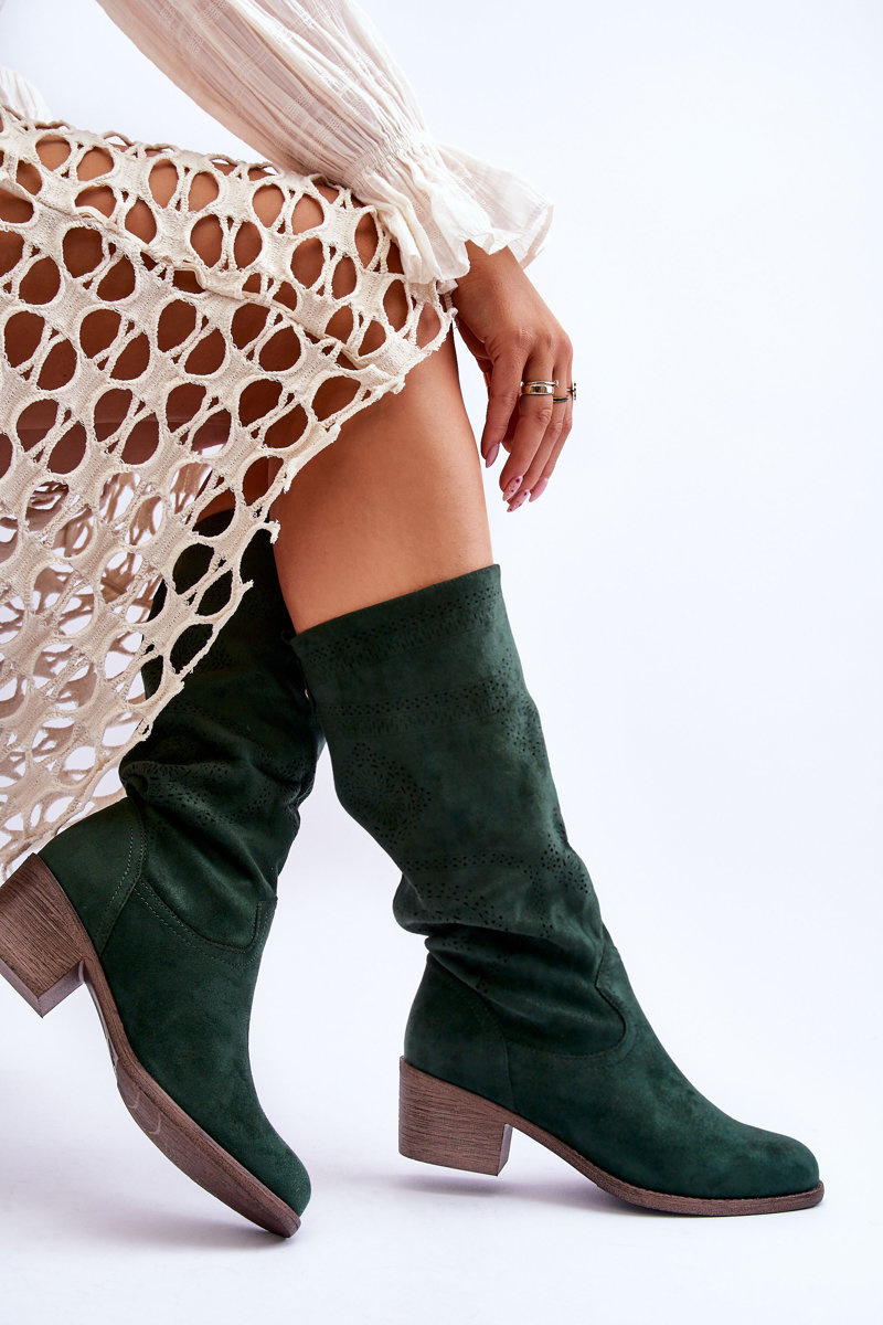 Krásné dámské kozačky nad kolena zdobené ažurovým vzorem. Svršek je vyroben z na dotek příjemného ekologického semiše. Podpatek u těchto bot je vyztužený. Kozačky mají podpatek v podobě nízkého masivního sloupku. Měkká stélka je vyrobena z materiálu. Nazouvací kozačky mají mandlovou špičku, která opticky zeštíhluje nohy. Při výběru velikosti se prosím řiďte tabulkou velikostí.