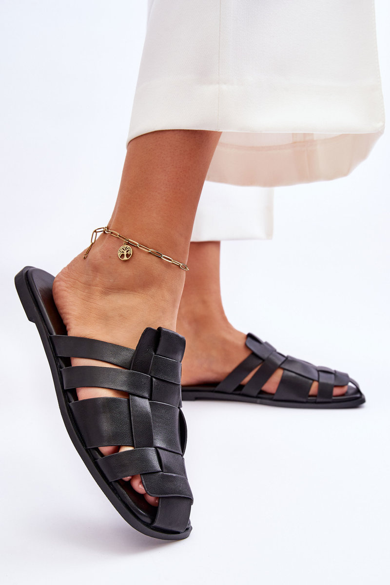 Klasické dámské pantofle jsou vyrobeny z eko kůže. Tento model je nazouvací s částečně krytým nosem. Nasazeno na plochém podpatku a gumové, protiskluzové podrážce. Měkká stélka je rovněž vyrobena z eko kůže. Tento model je ideální pro horké dny! Určitě byste je měli mít! Při výběru velikosti použijte prosím tabulku velikostí.