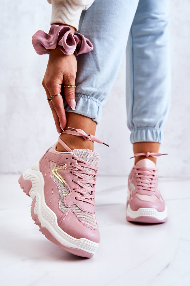 Sportovní boty namontované na masivní platformě a klínech. Tenisky jsou vyrobeny z kombinace látky a eko kůže. Svršek je navíc pokrytý třpytivými třpytkami. Boty mají ploché tkaničky a holografické vsadky. Podešev z pryžového materiálu je navíc protiskluzová. Stélka je vyrobena z materiálu, měkkého a pohodlného na používání. Skvělý model pro každodenní použití! Při výběru velikosti použijte tabulku velikostí.